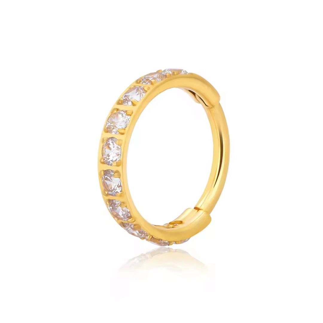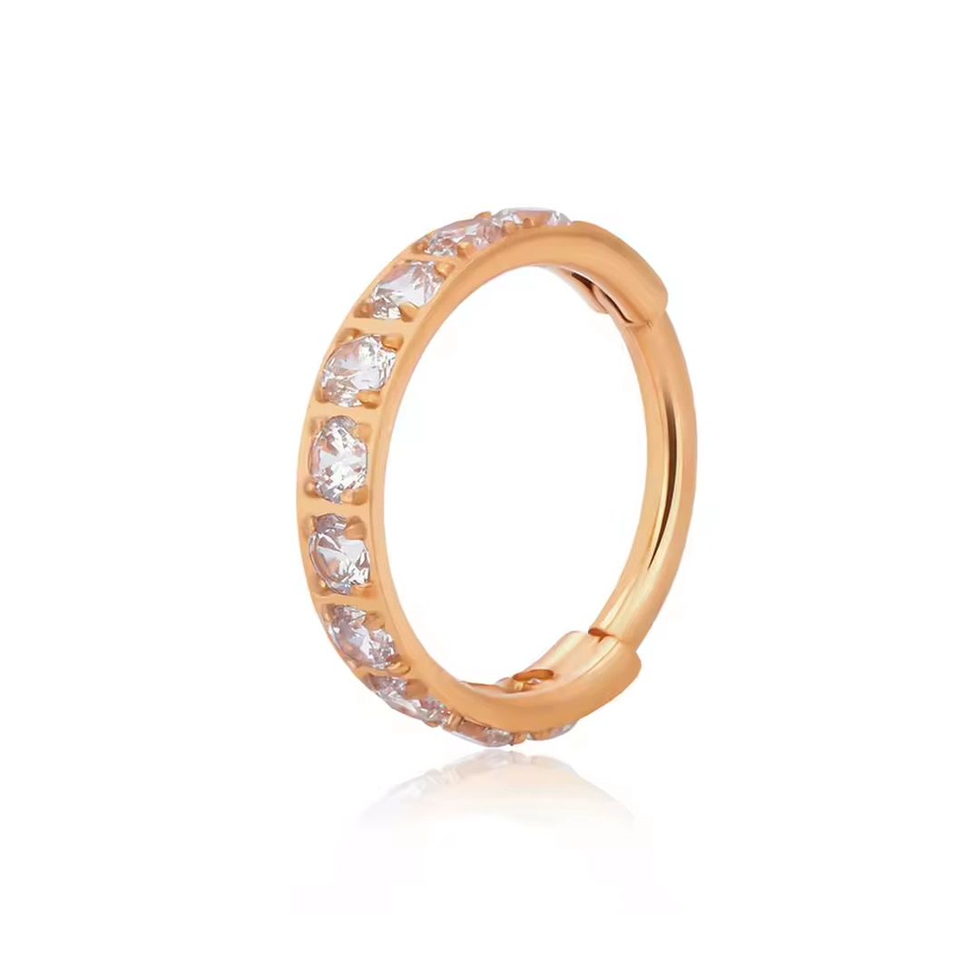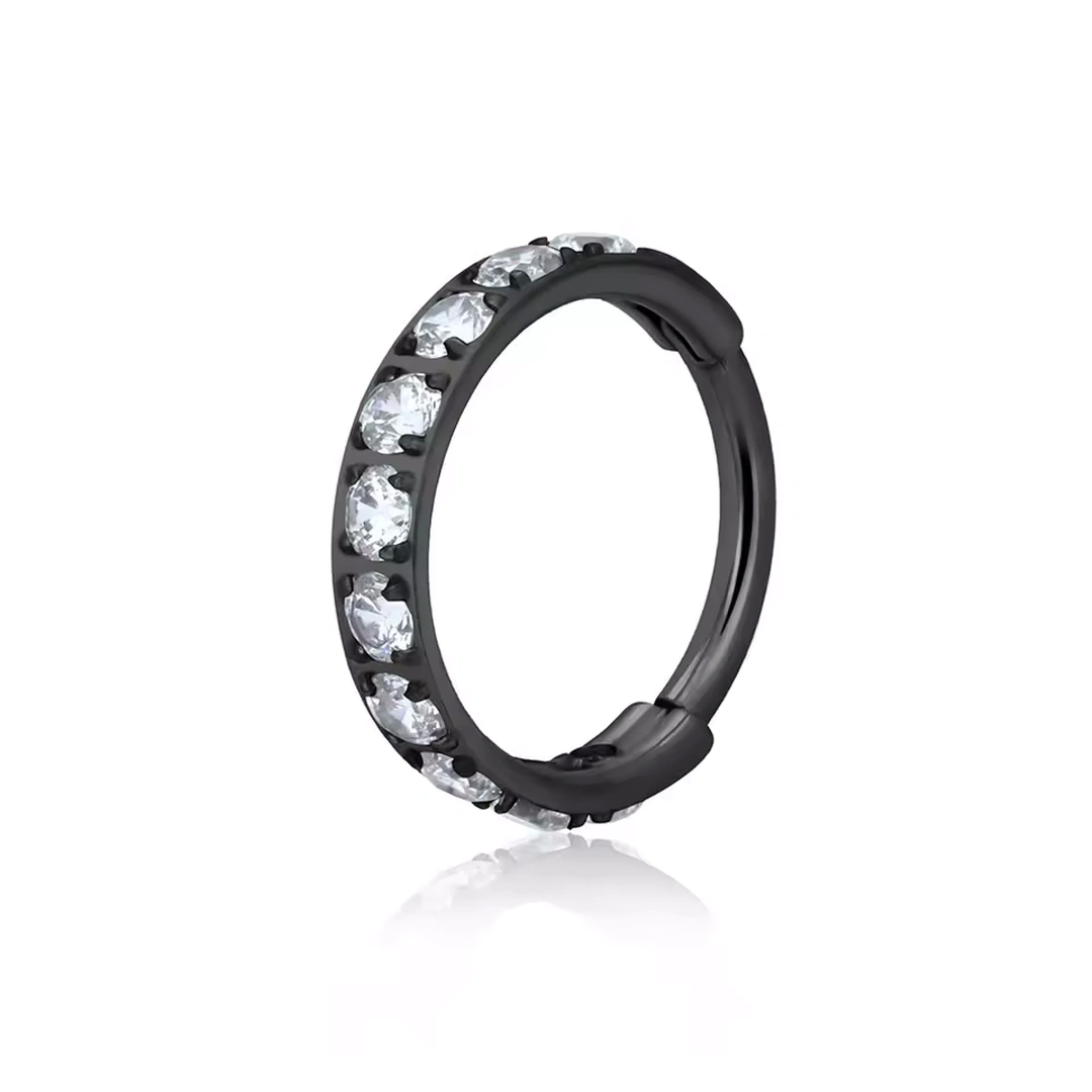 Anneau de piercing clicker en titane ASTM-F136, serti de zircons étincelants. Idéal pour le lobe, cartilage, septum ou arcade. Bordure 2 mm & diamètre 8-12 mm.