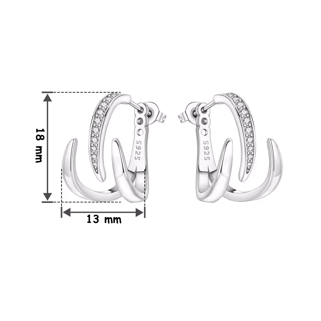 Boucles d’oreilles en argent 925 à design griffes : double structure, partie réglable sous le lobe et ligne pavée de zircons pour un relief moderne.