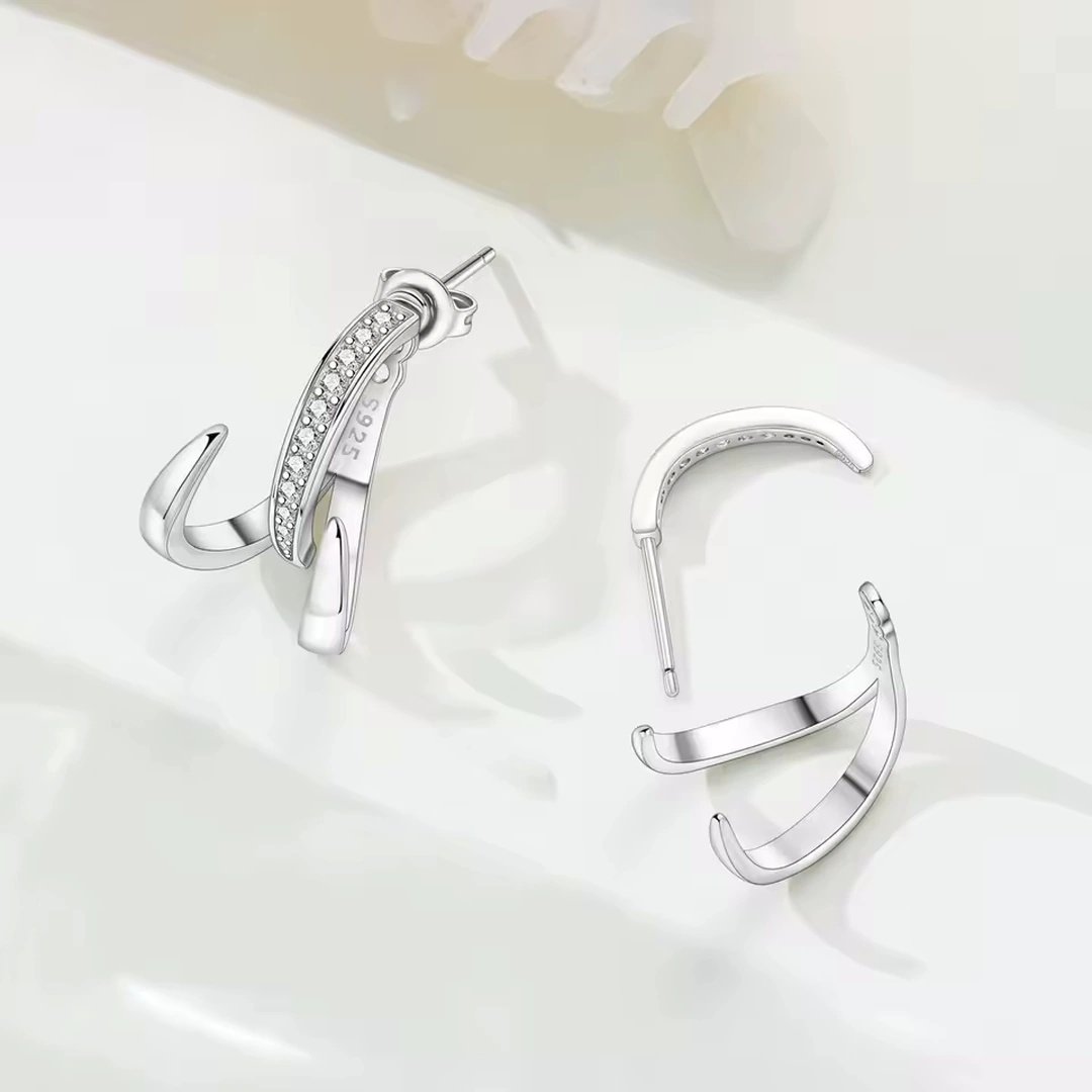 Ces boucles d’oreilles en argent 925 ne se contentent pas de se poser sur le lobe : elles l’enveloppent. Leur construction en deux parties crée une mise en scène visuelle où le bijou devient structure.