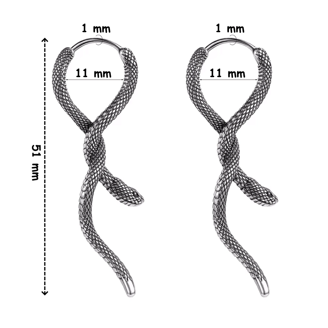 Pendantes serpent en acier 316L, hauteur 51 mm. Boucles d’oreilles au design texturé, effet illusion à travers le lobe, présence forte et mouvement maîtrisé.