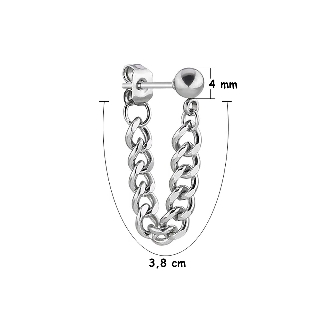 Ces boucles d’oreilles en acier 316L s’articulent autour d’une perle lisse de 4 mm, posée au lobe comme un repère. De cette base naît une chaînette double qui descend, se balance et revient vers l’arrière, créant une ligne fluide et continue.