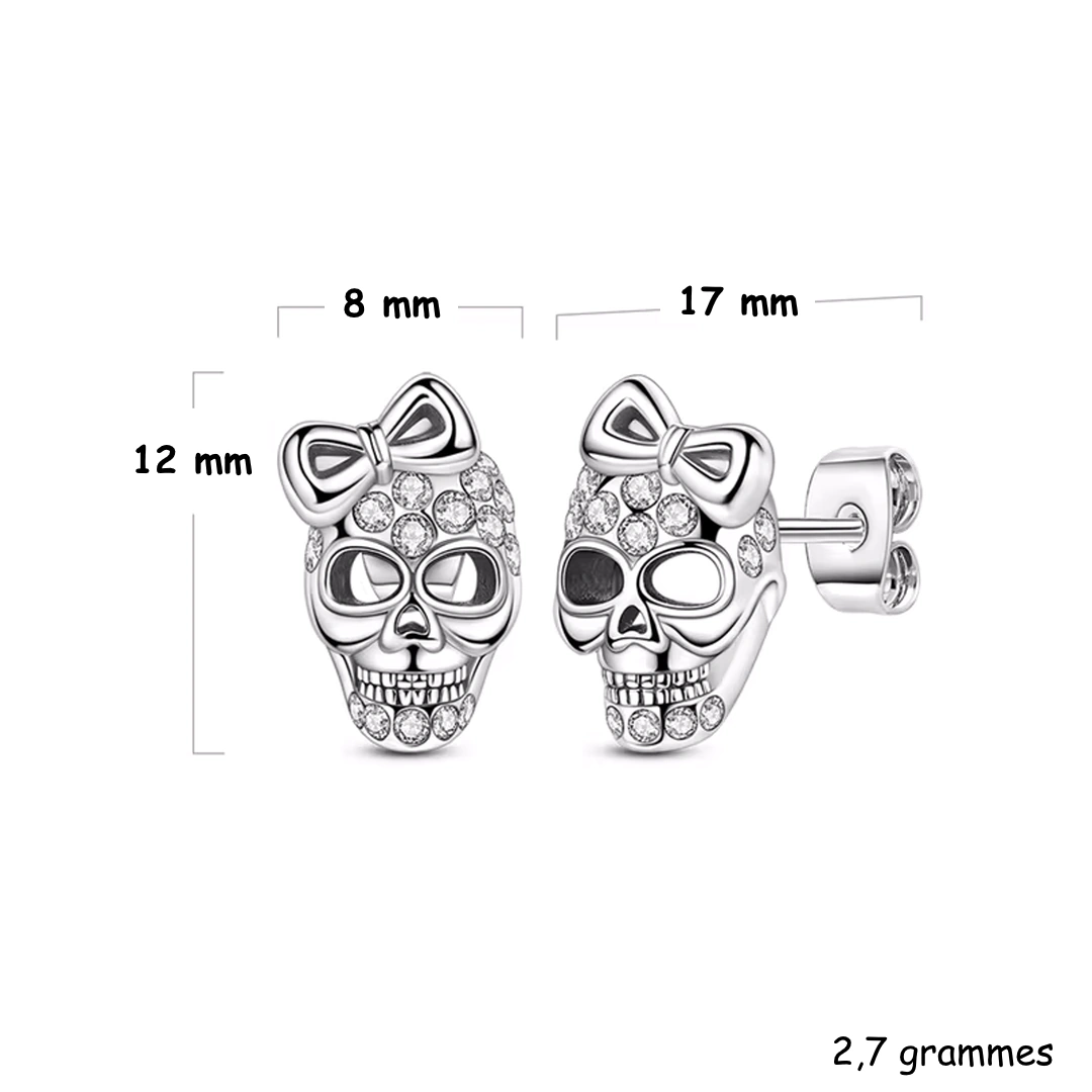 Clous d’oreilles tête de mort en argent 925 avec nœud et zircons. Format 12 × 8 mm, élégantes et légères (2,7 g), style gothique décalé et lumineux.