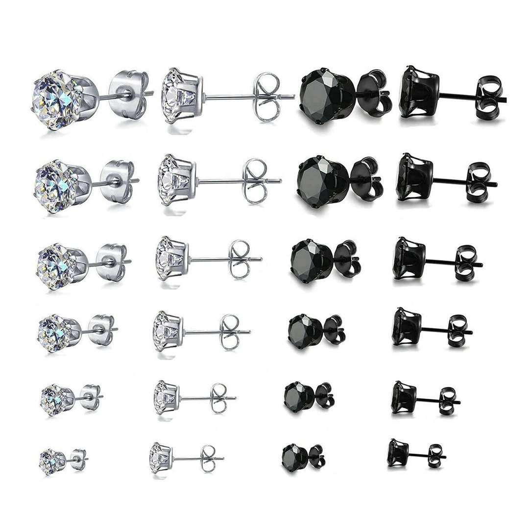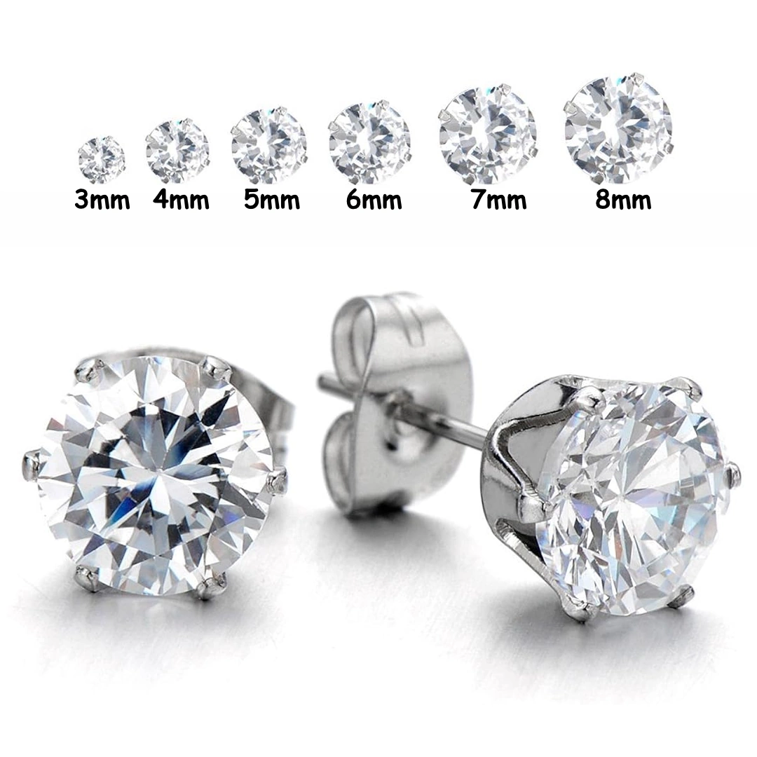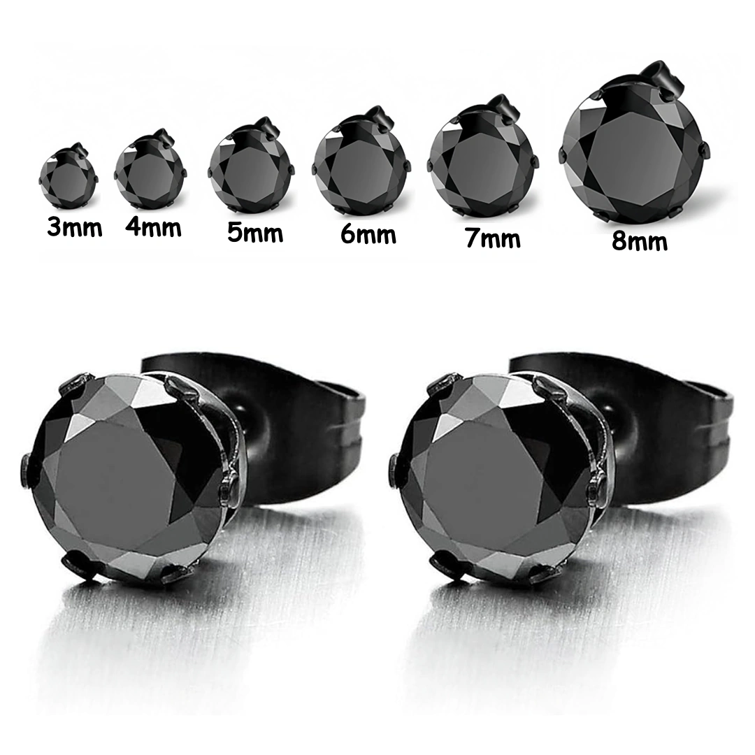 Clous d’oreilles zircon facetté hexagonal en acier 316L, Ø 3 à 8 mm. Serti à griffes, finition acier poli ou noir PVD, design graphique unisexe.