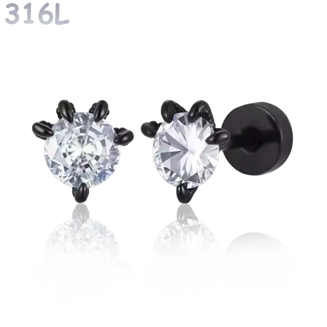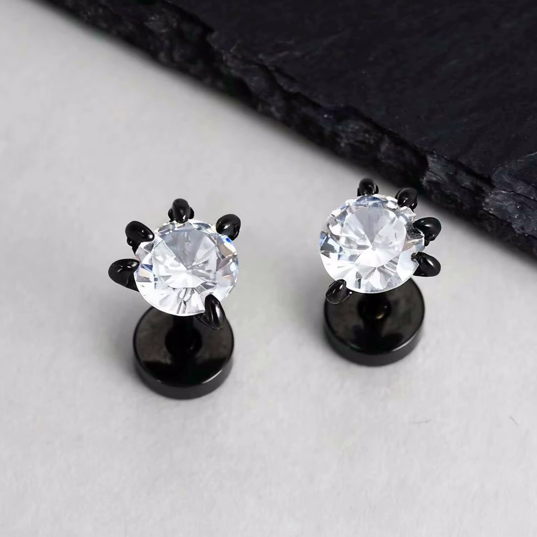 Boucles d’oreilles en acier 316L noir PVD avec zircon cubique 6 mm, serti par 5 griffes évoquant une main démoniaque. Fermoir fileté sécurisé.
