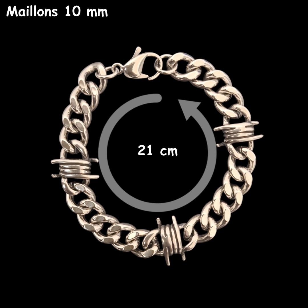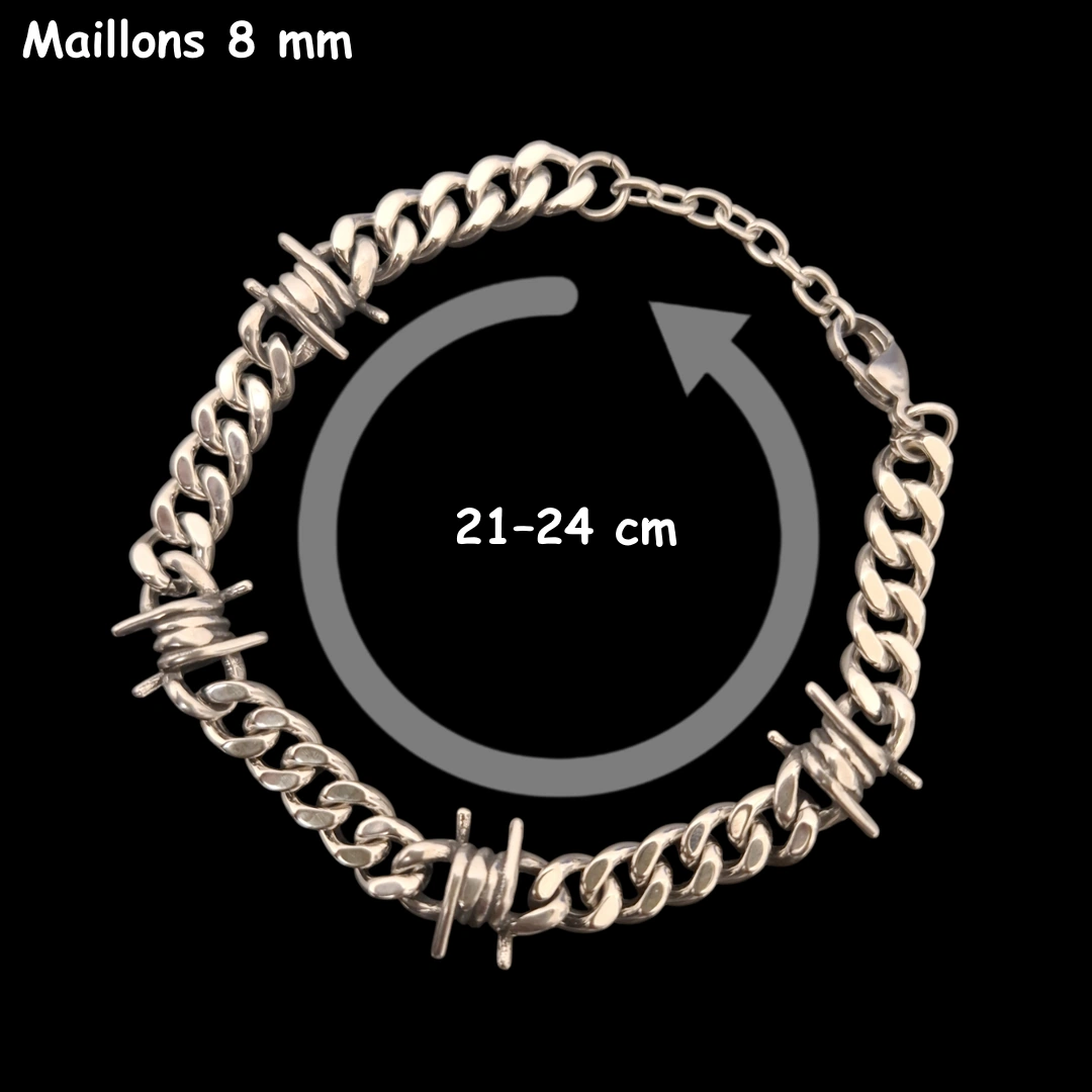 Bracelet cubain barbelé en acier 316L. Maillons 6, 8 ou 10 mm, longueurs ajustables, fermeture mousqueton fiable, style brut et affirmé.