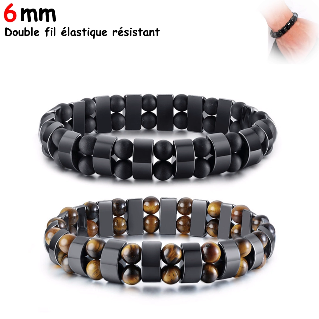 Bracelet élastique double fil en perles Œil de Tigre ou Onyx Mat et segments hématite, élégant, solide et ajustable 17‑25 cm.