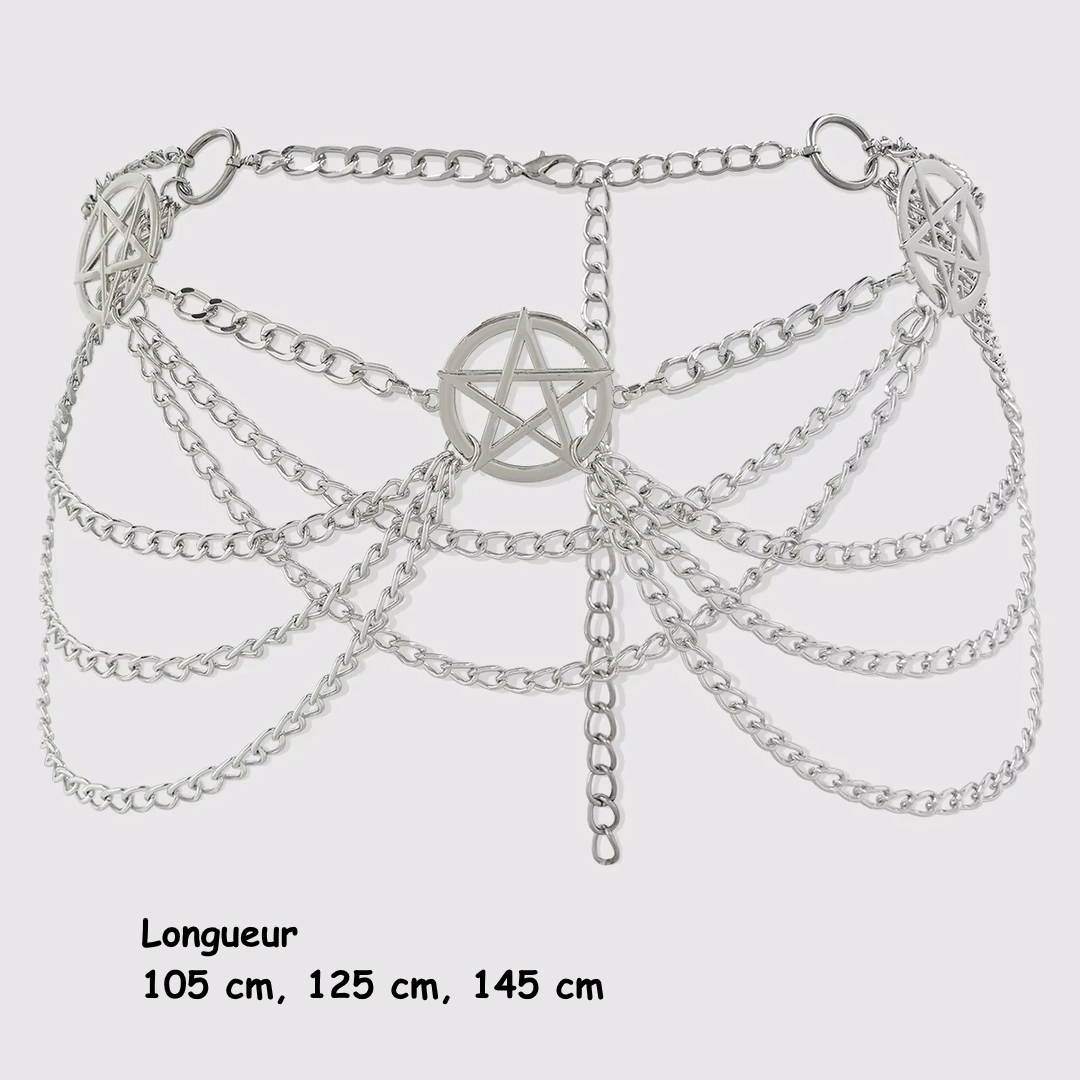 Ceinture chaîne de taille en acier 316L avec 3 pentacles et chaînes superposées. Finition acier poli. Longueurs 105, 125 ou 145 cm.