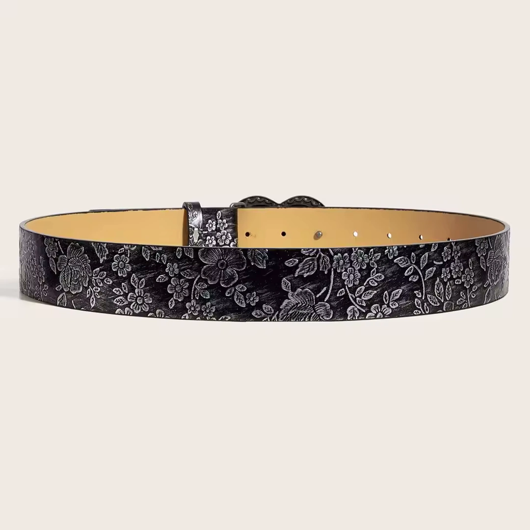 Ceinture Fleurie Noire Similicuir à Boucle Cœur Vintage