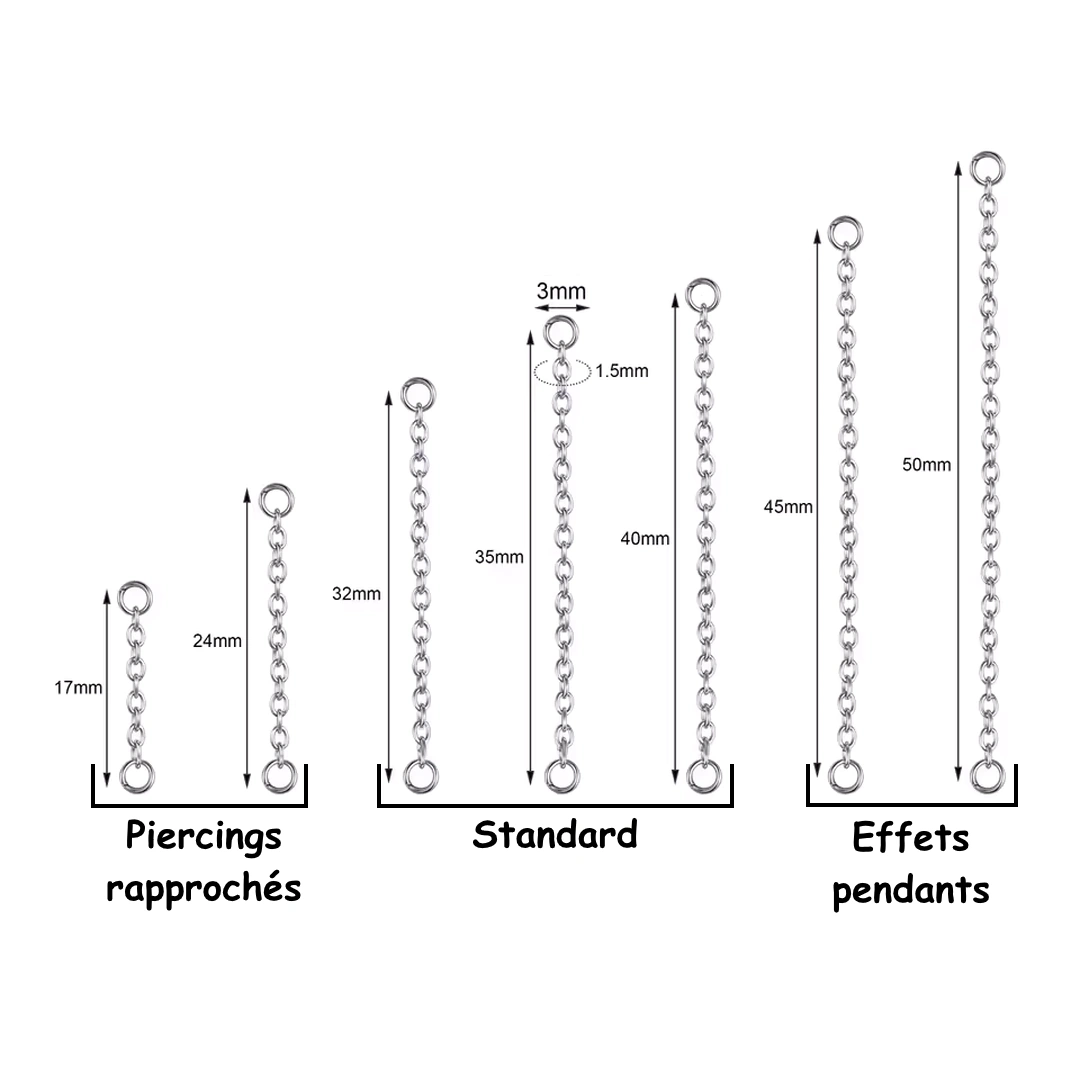 À chaque extrémité, un anneau de 3 mm de diamètre s’accroche facilement à vos bijoux (studs, anneaux, labrets à embout vissable, etc.).