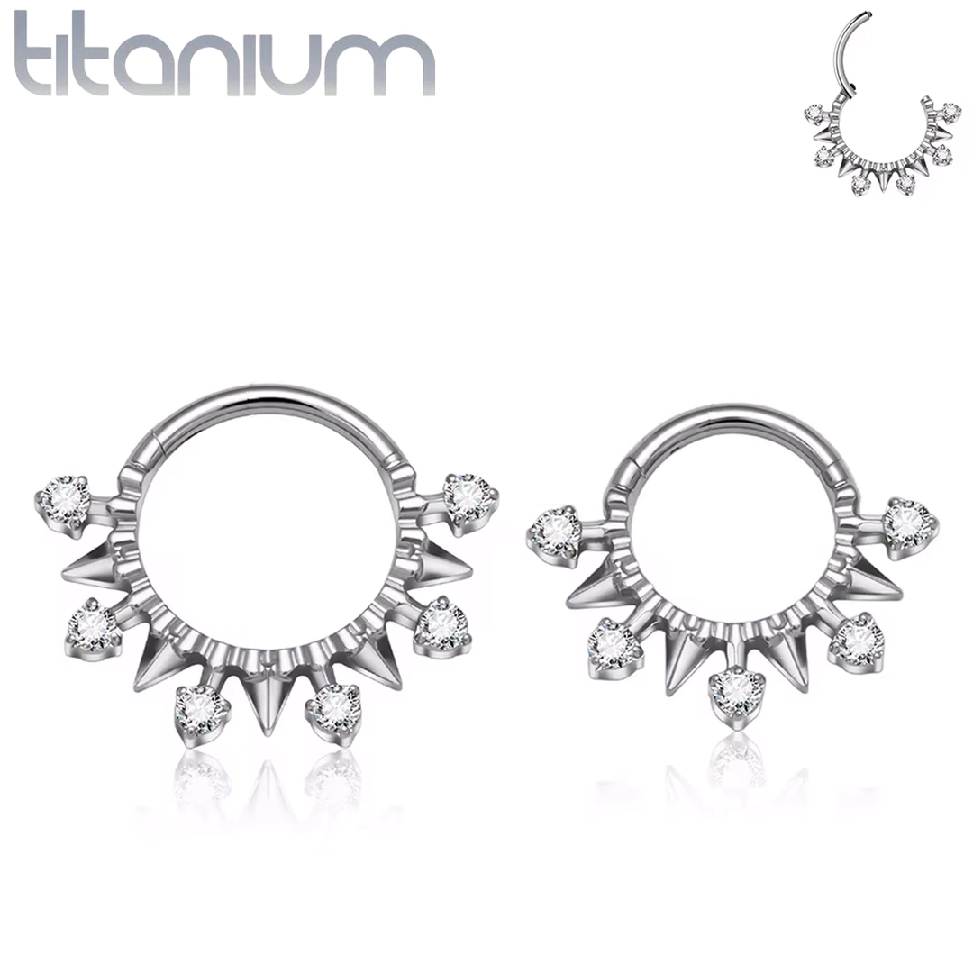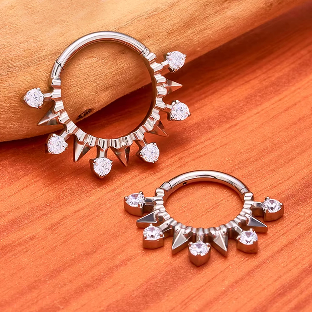 Piercing Clicker en titane ASTM-F136 avec arc de pointes et zircons 2 mm. Modèle 8 mm (4 pointes) ou 10 mm (5 pointes). Idéal septum et cartilage.