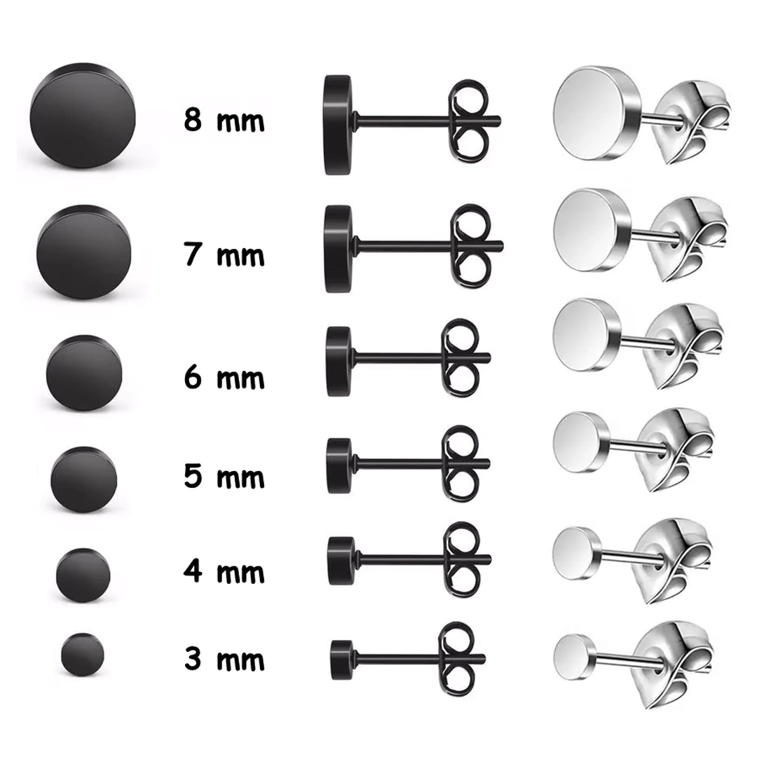 Clous d’oreilles disque en acier 316L, Ø 3 à 8 mm, finition miroir ou noir PVD. Design minimaliste, fermoir poussette, unisexe et durable.