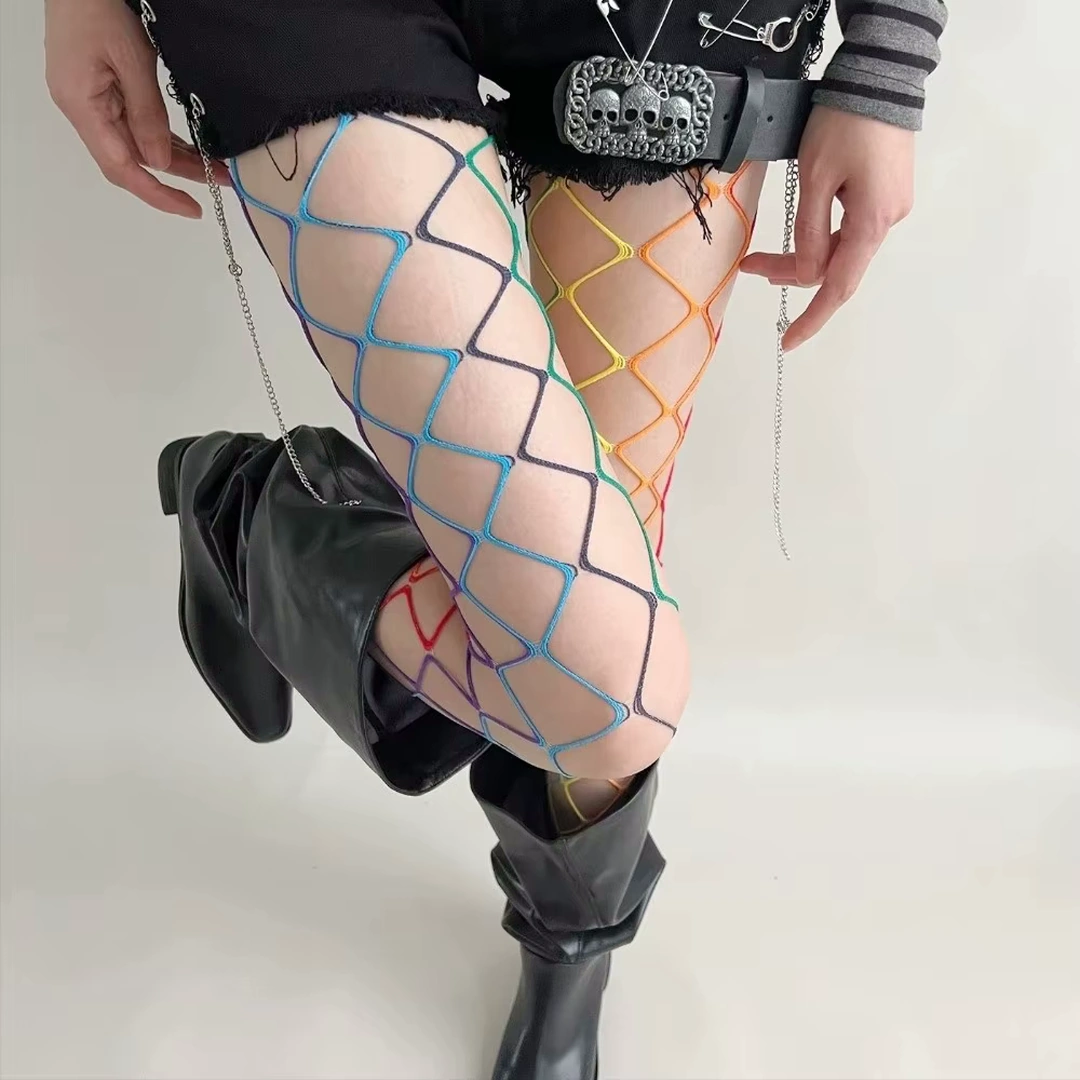Ces collants résille arc-en-ciel transforment instantanément une tenue en déclaration visuelle.