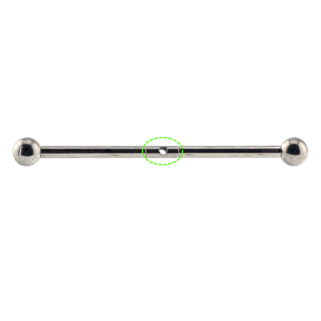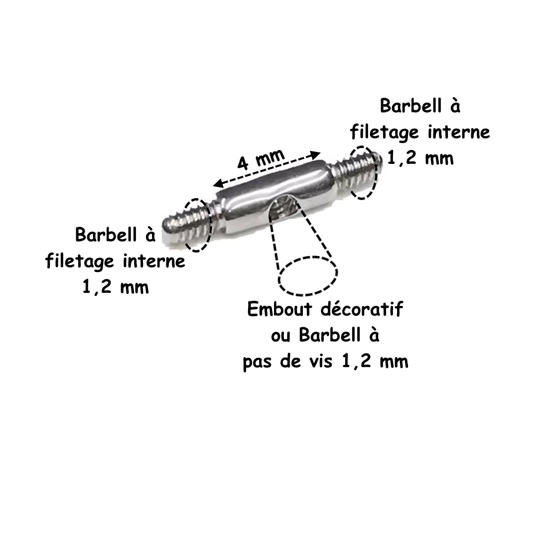 À chaque extrémité, son filetage externe 1,2 mm accueille n’importe quelle tige droite à filetage interne 1,2 mm. Il relie deux barbells pour créer une barre plus longue, ajuster un trajet, ou adapter un piercing à une anatomie particulière.