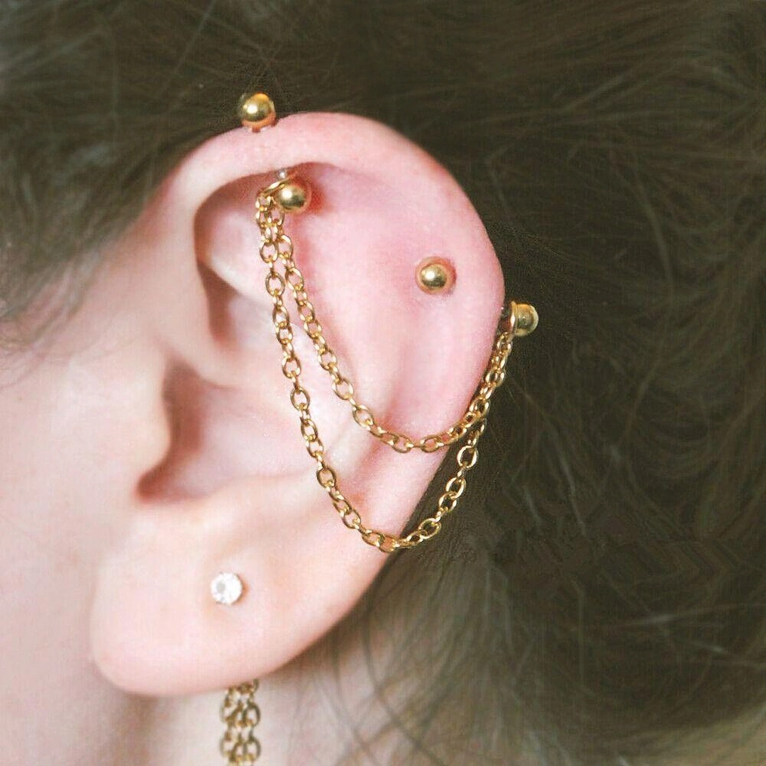 Pensé pour relier deux piercings, ce bijou se prête particulièrement bien aux piercings du cartilage, comme un double industriel, un hélix tragus, mais peut également être porté entre deux piercings du lobe pour un effet moderne et stylisé.