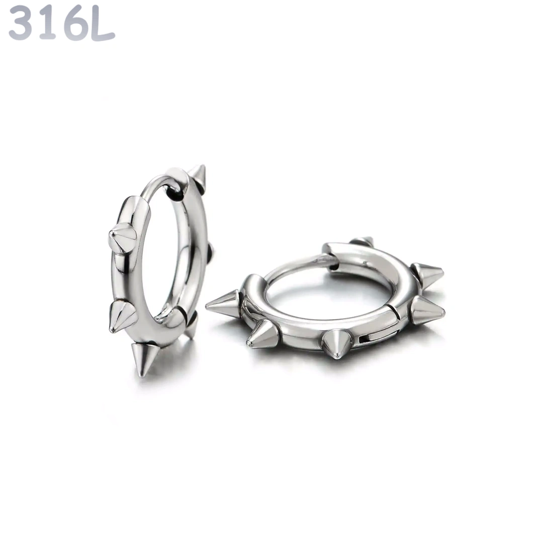 Ces créoles en acier 316L reprennent un symbole fort de l’esthétique alternative : l’anneau classique transformé par une série de pointes acérées, réparties sur toute sa circonférence.