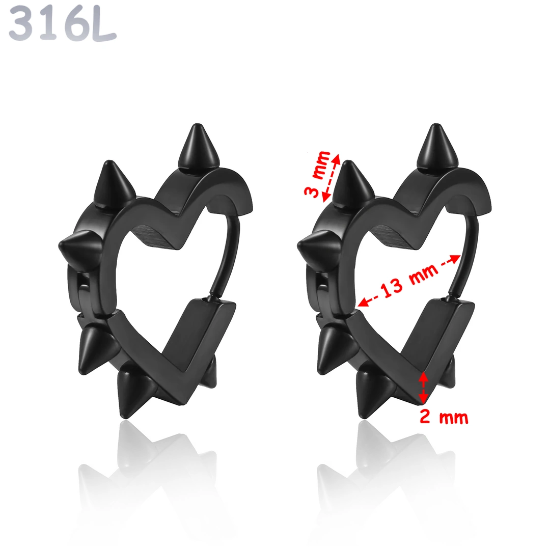 Créoles cœur clouté en acier 316L. Diamètre interne 13 mm, pointes 3 mm. Design gothique/punk affirmé, finitions acier poli ou noir PVD.