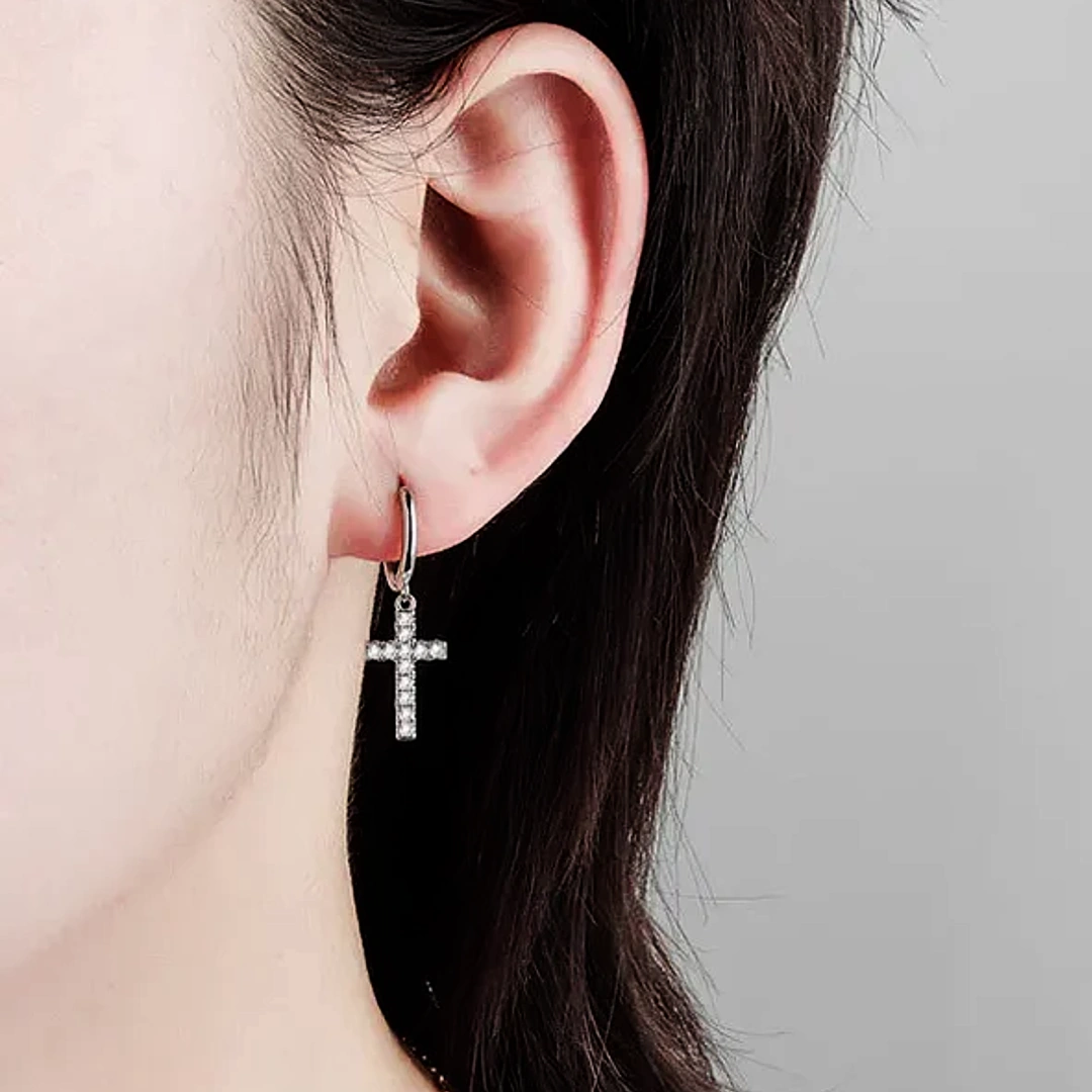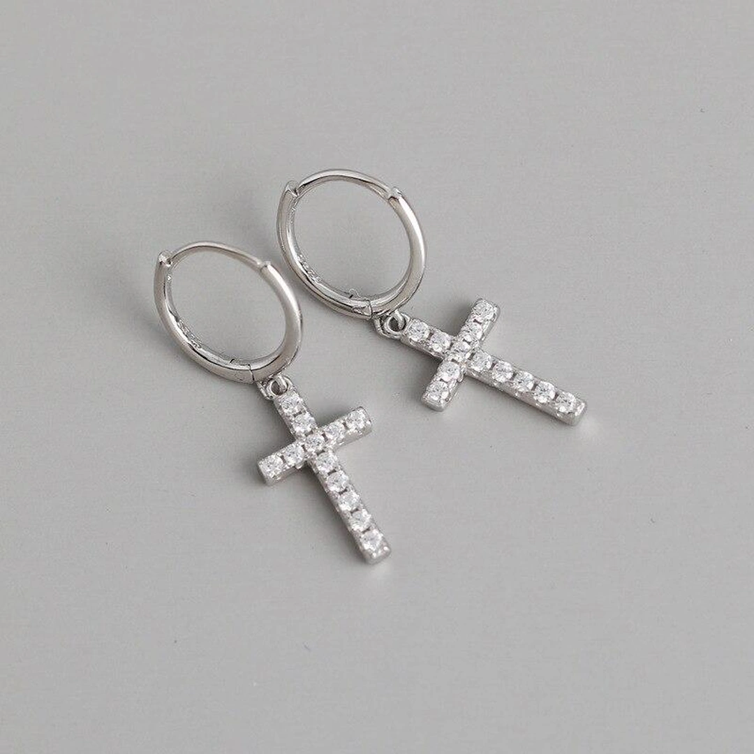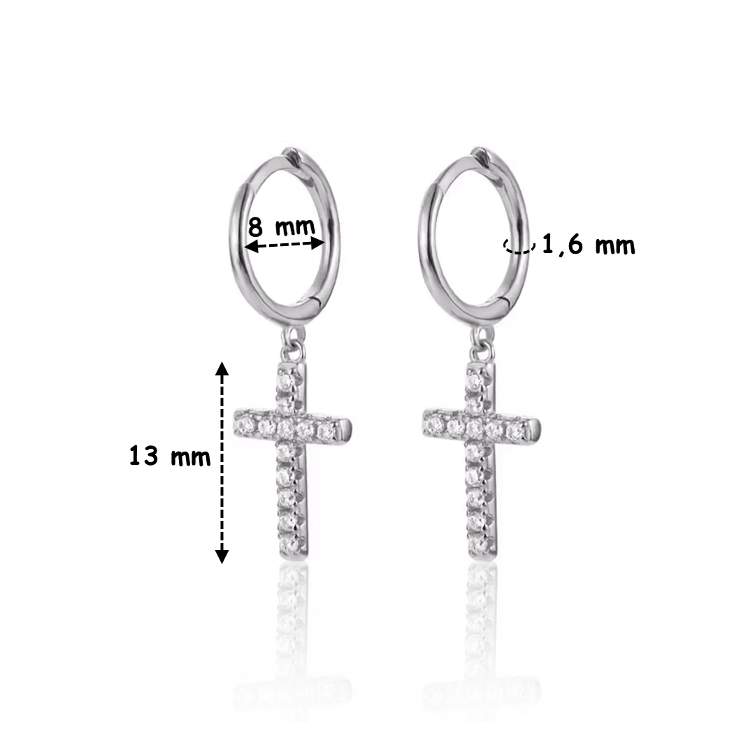 Créoles croix pavée en argent 925 avec zirconiums, anneau 8 mm et pendentif 13 mm. Élégantes, lumineuses et symboliques au quotidien.