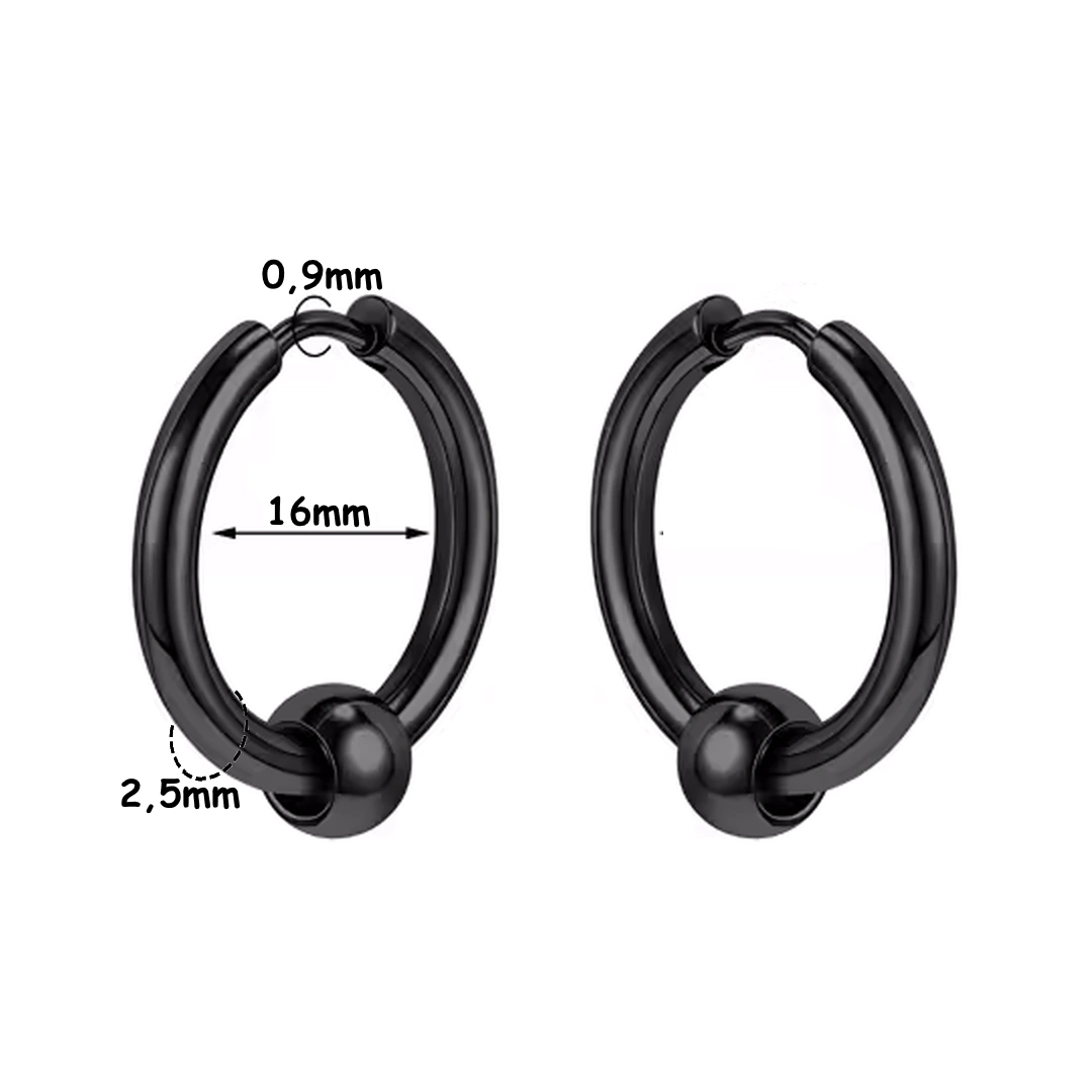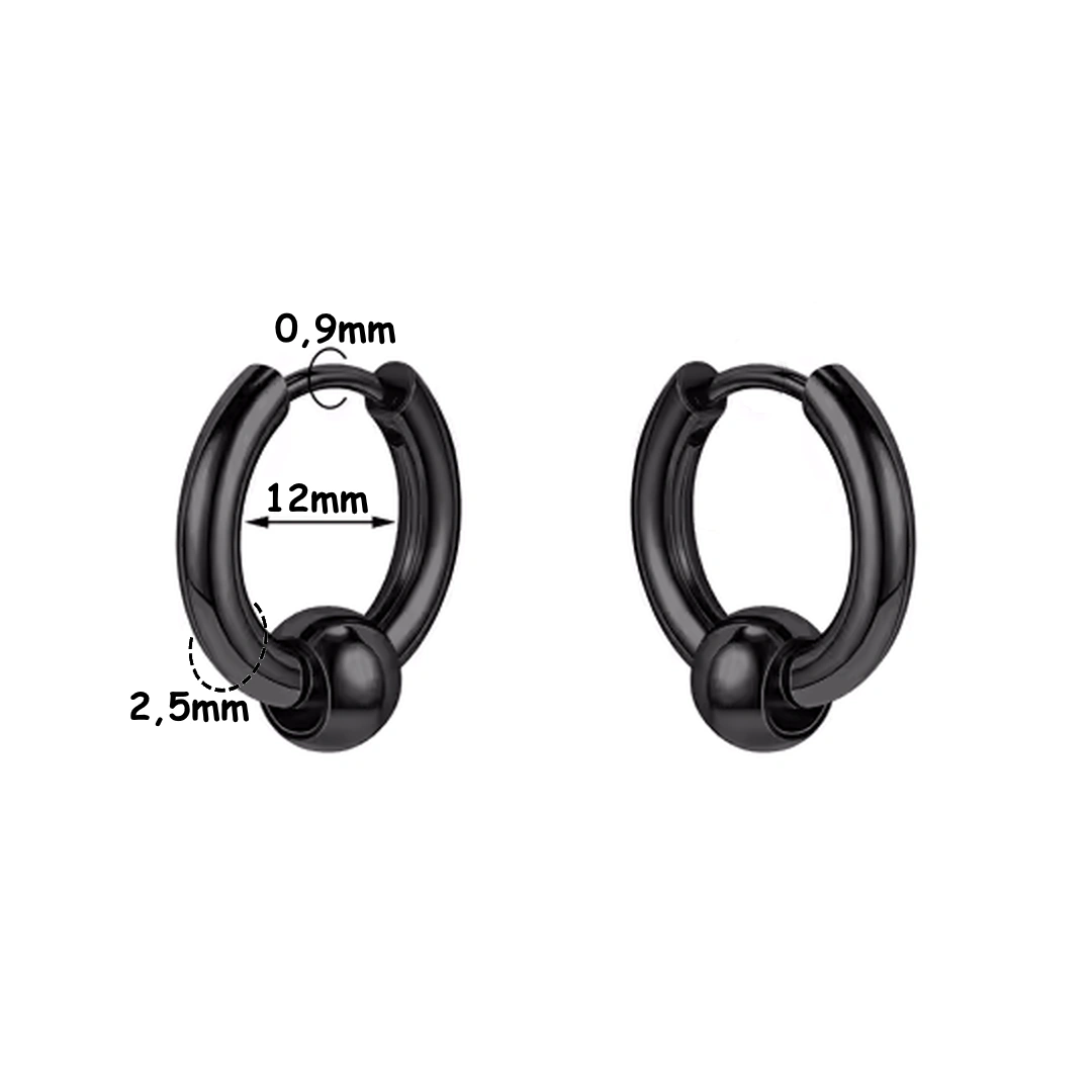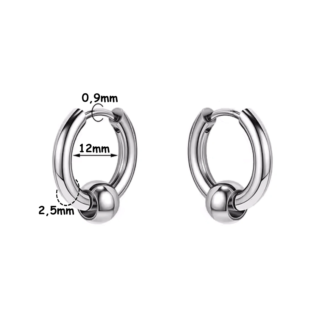 Créoles épaisses en acier 316L, finition poli ou noir PVD, avec bille décorative. Diamètres 12/14/16 mm, tige 2,5 mm. Style bold et confortable.