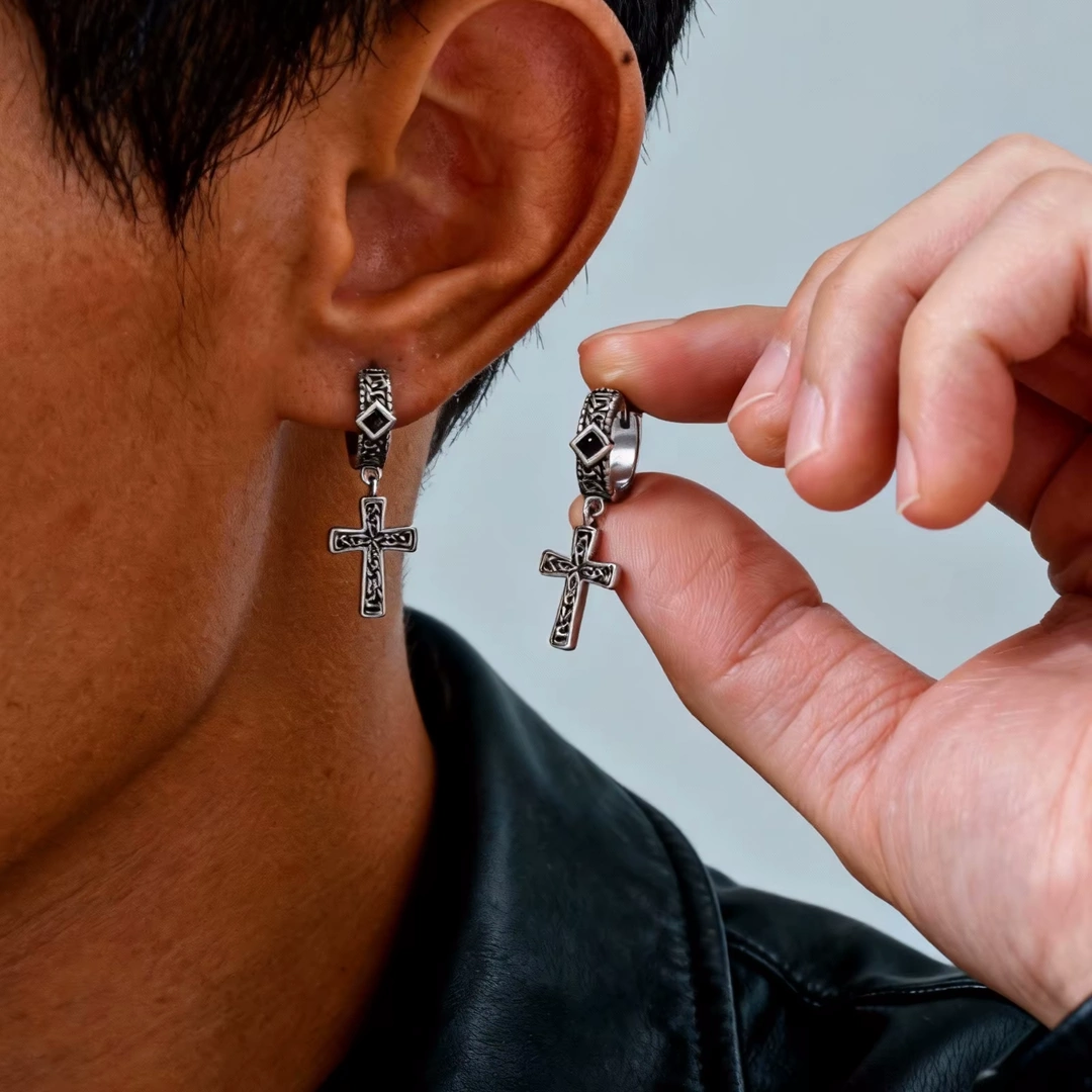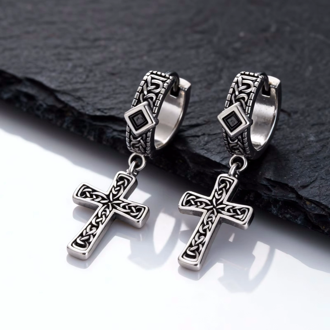 Conçues en acier chirurgical 316L, elles offrent une excellente résistance à l’usure et un port sûr au quotidien. Leur diamètre interne de 10 mm permet un maintien près du lobe, discret et équilibré, tandis que le pendentif croix apporte verticalité et présence sans excès.
