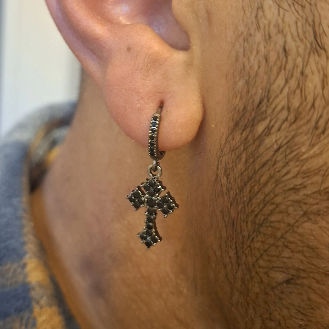 Créoles pendantes en acier 316L avec croix pavée de zirconiums noirs. Anneau 9 mm discret, finition fine et élégante, style gothique raffiné.