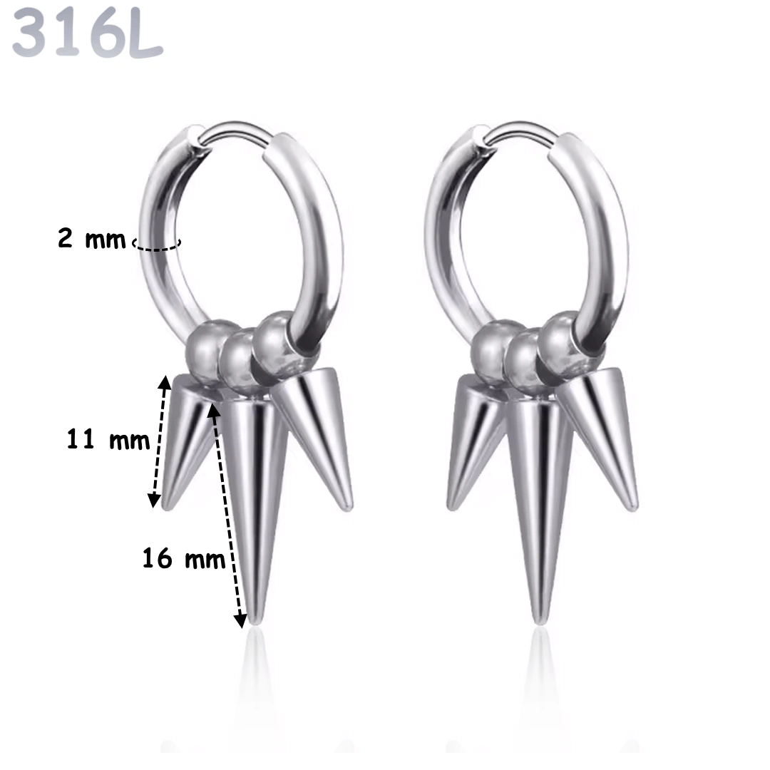Créoles triple spike en acier chirurgical 316L avec pointes 11 et 16 mm. Fermeture clicker, finition poli ou noir PVD, style punk radical.