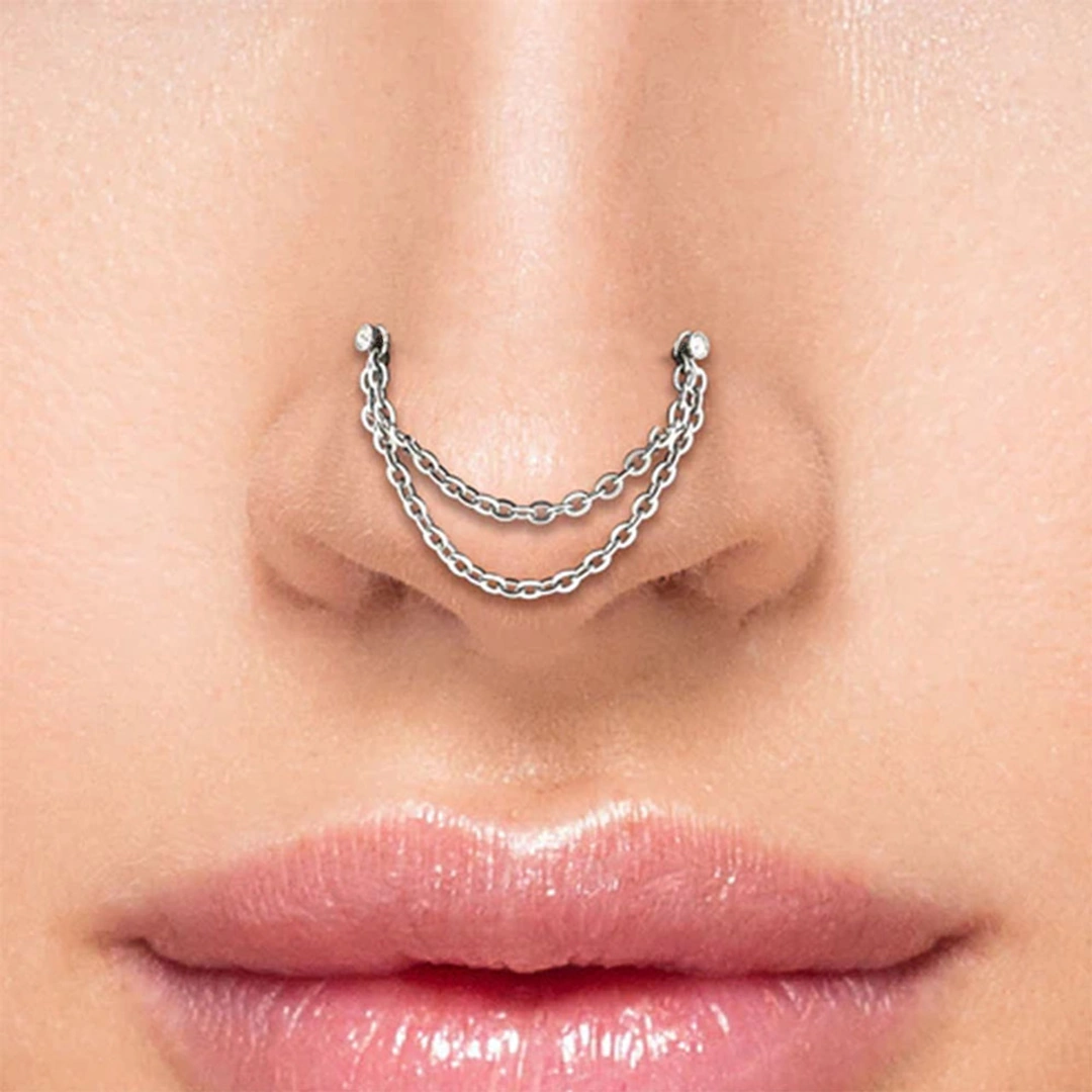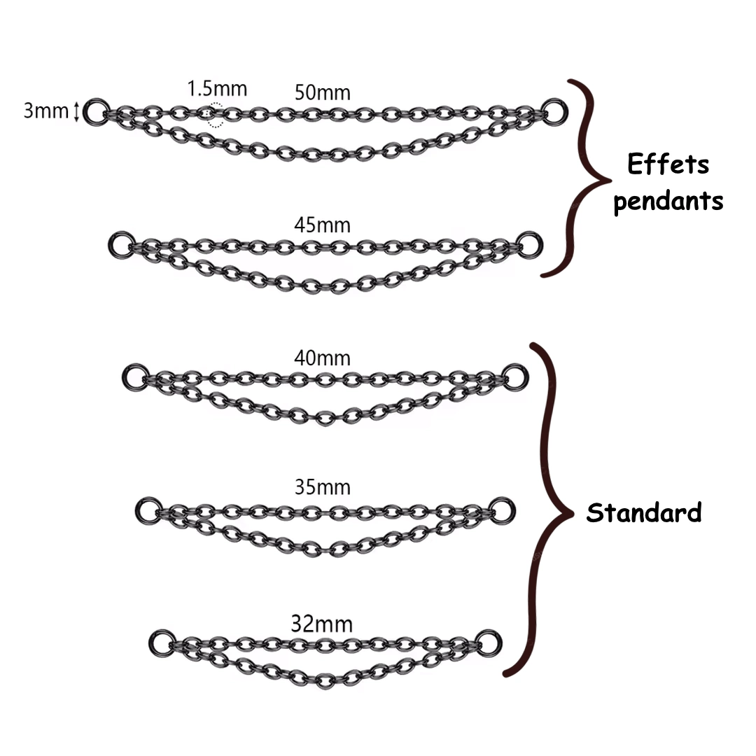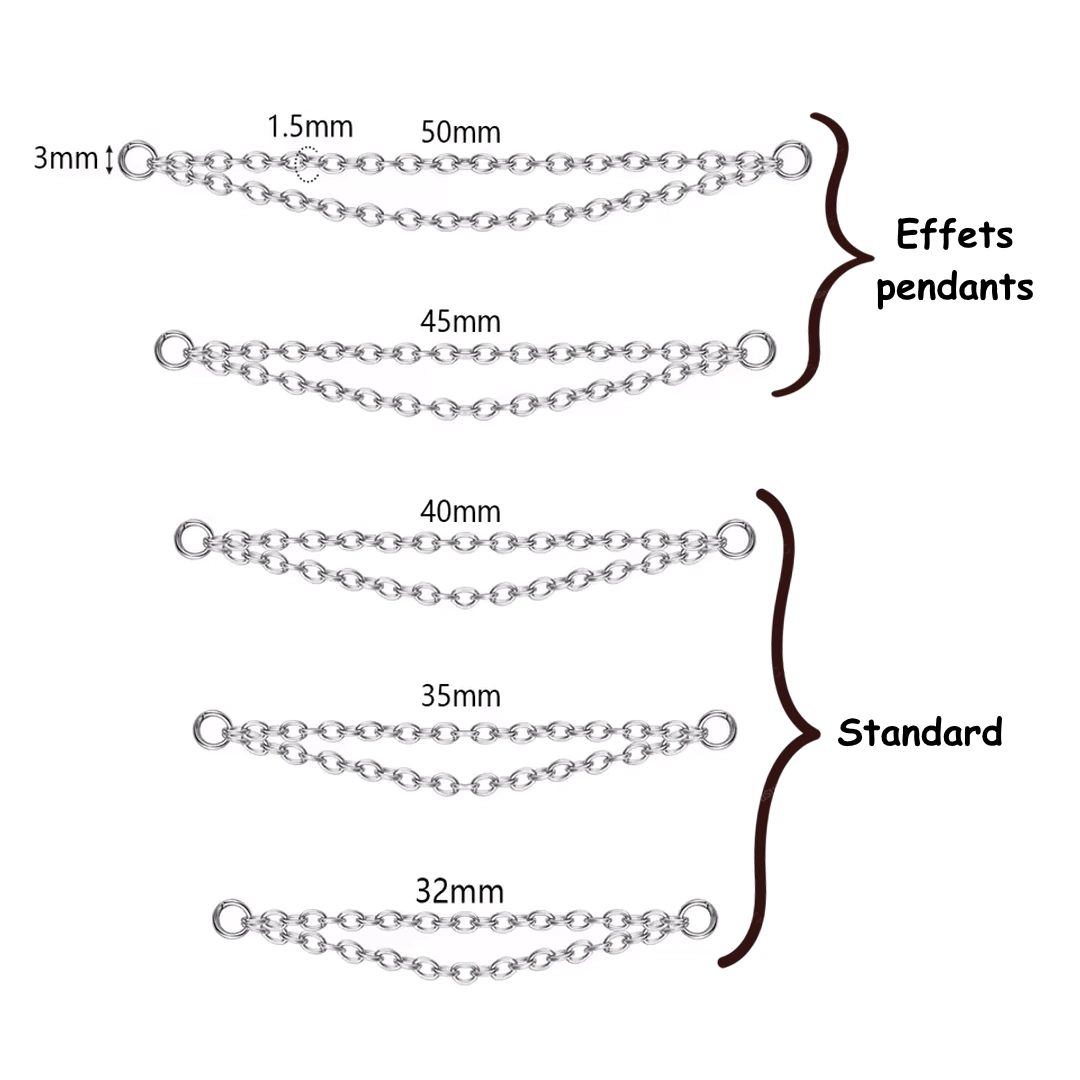 Double chaîne en acier chirurgical 316L pour relier deux piercings. Longueurs 32 à 50 mm, finitions poli ou noir PVD. Idéal nez & cartilage.
