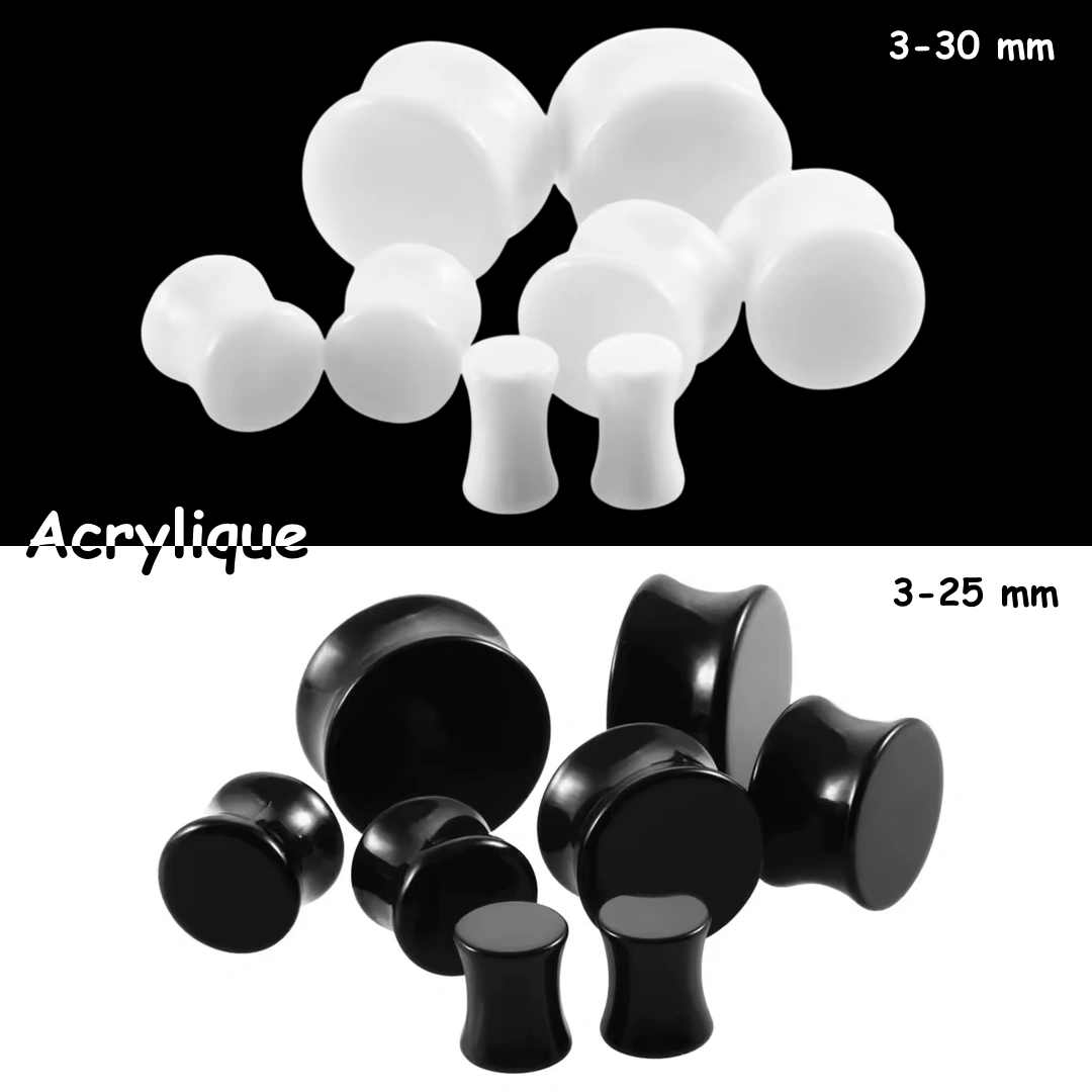 Plug d’oreille en acrylique couleur blanc ou noir, double évasé, léger et confortable. Disponible du 3 au 30 mm. Écarteur vendu à l’unité.