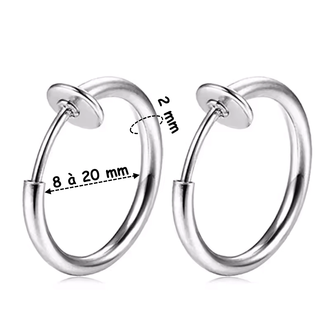 Faux piercing ou boucle d’oreille créole à ressort en acier 316L. Épaisseur 2 mm, diamètre interne 8 à 20 mm. Finition poli ou noir PVD avec pastille confort. Vendu par paire.