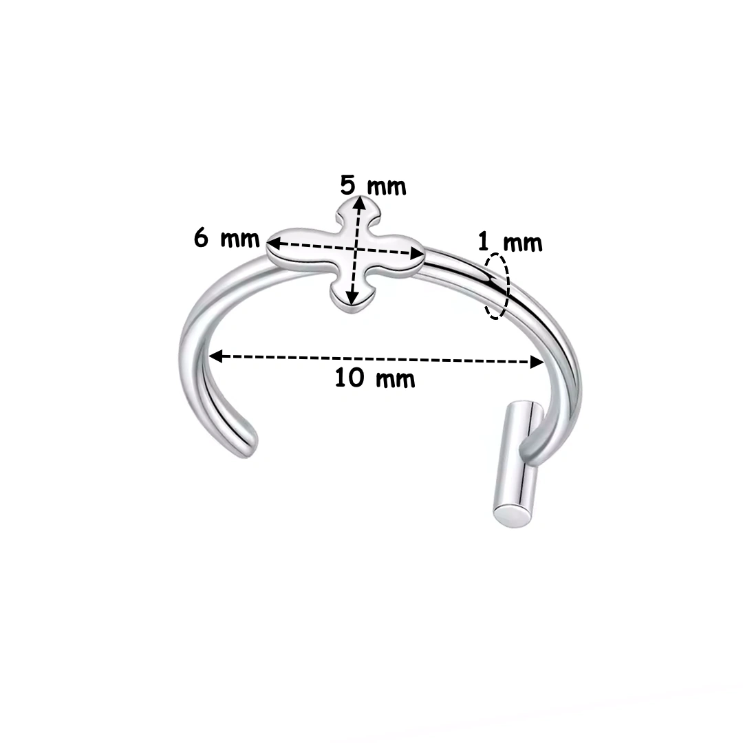 Ce faux piercing lèvre en dessine un anneau discret qui épouse naturellement la courbe de la lèvre inférieure. En son centre, une croix de 6 × 5 mm vient signer le bijou d’un détail à la fois graphique et symbolique.