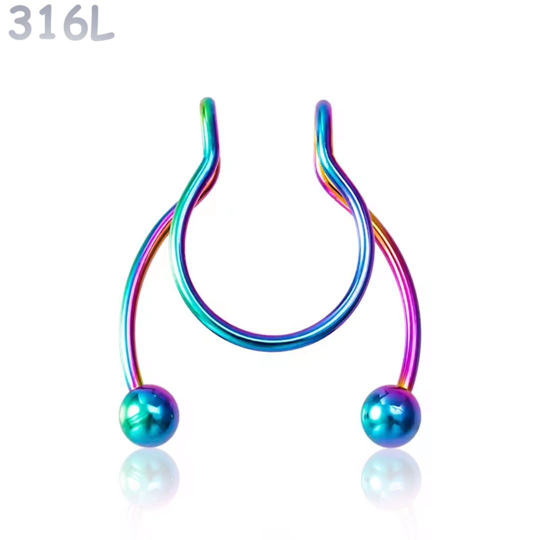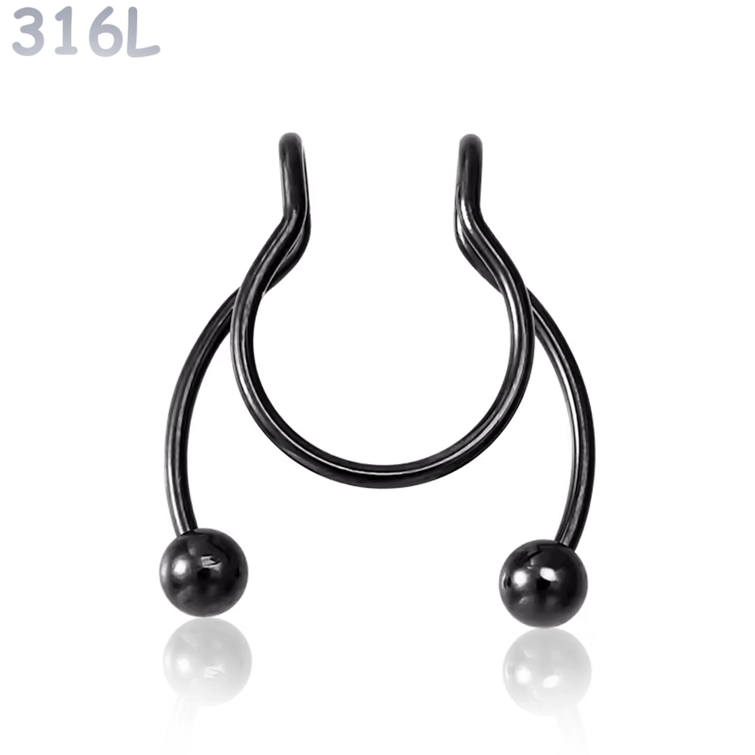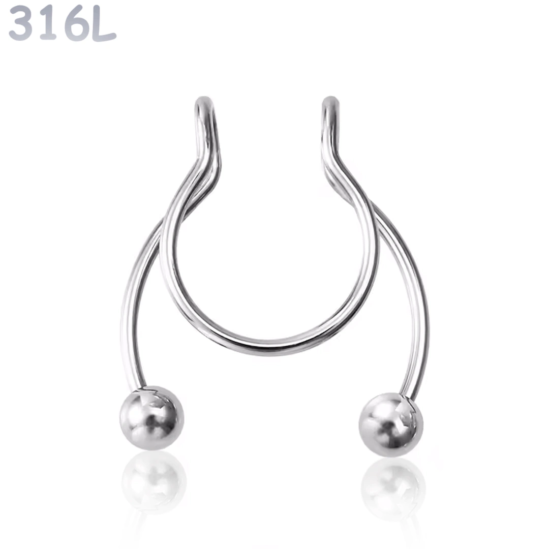 Faux piercing pour septum fer à cheval en acier chirurgical 316L avec billes. Diamètre 8 mm, tige 0,8 mm. Sans perçage, discret et confortable.