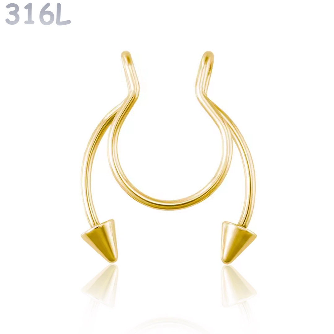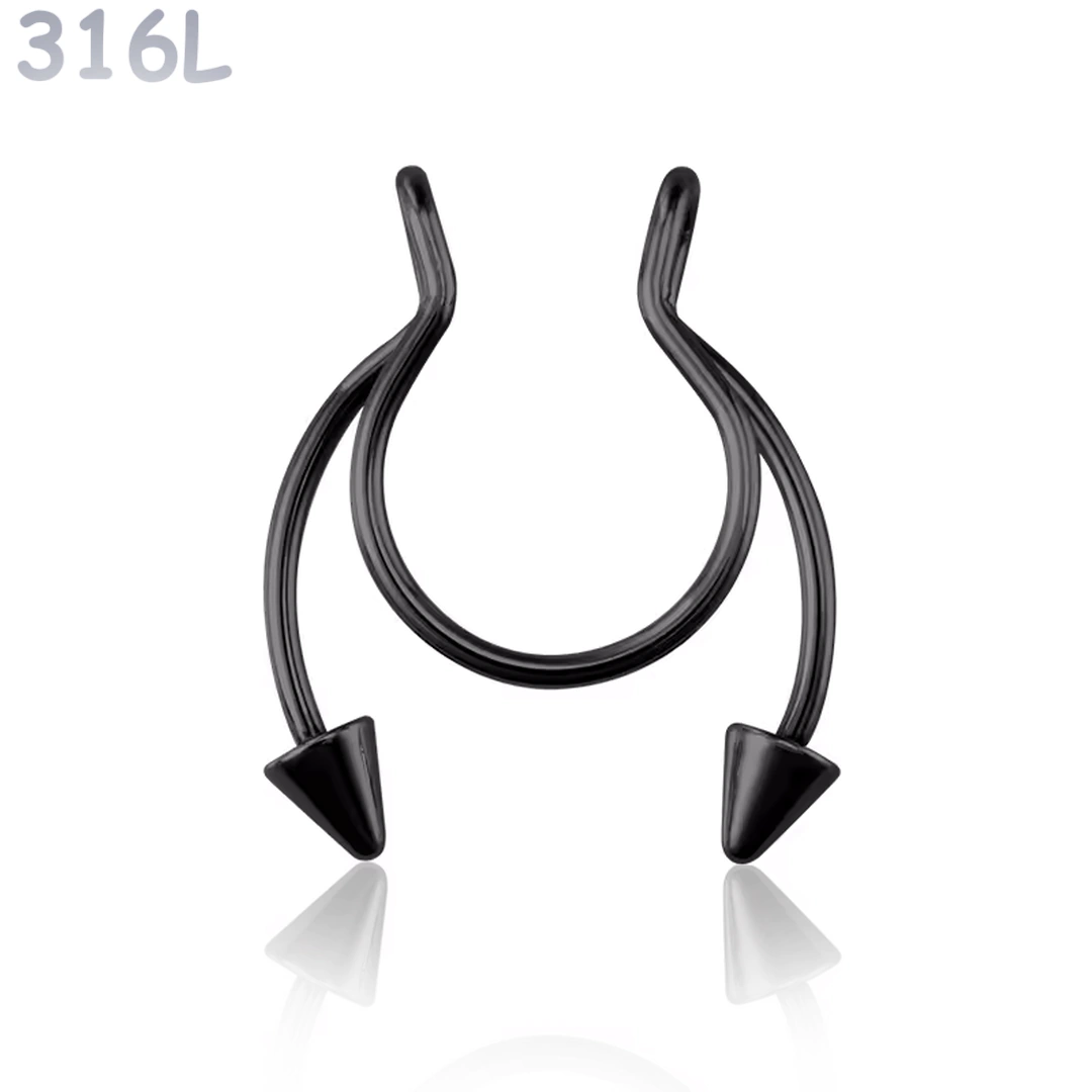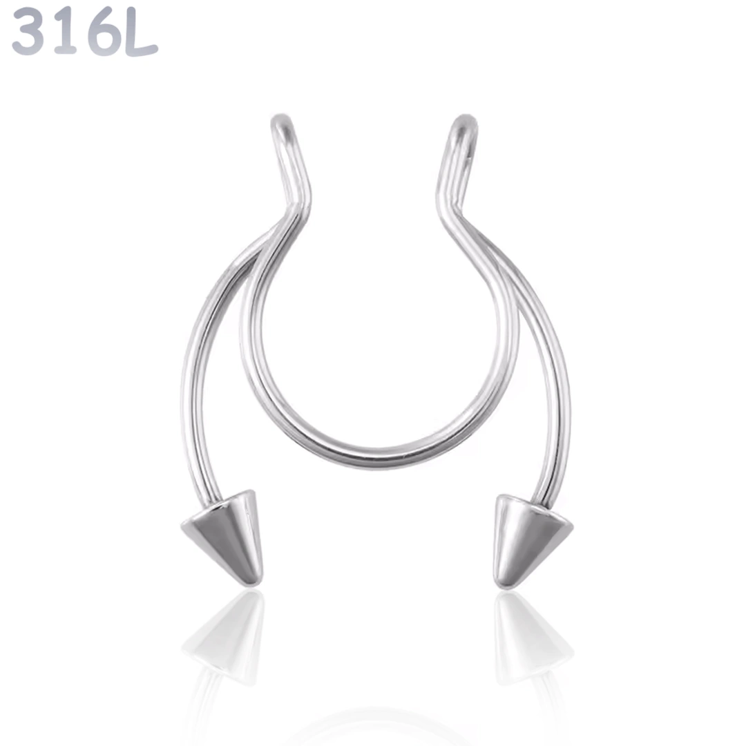 Faux piercing pour septum fer à cheval en acier chirurgical 316L avec pointes. Diamètre 8 mm, tige 0,8 mm. Sans perçage, style affirmé.