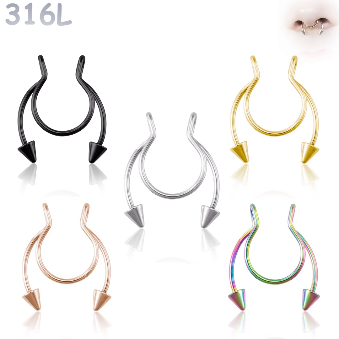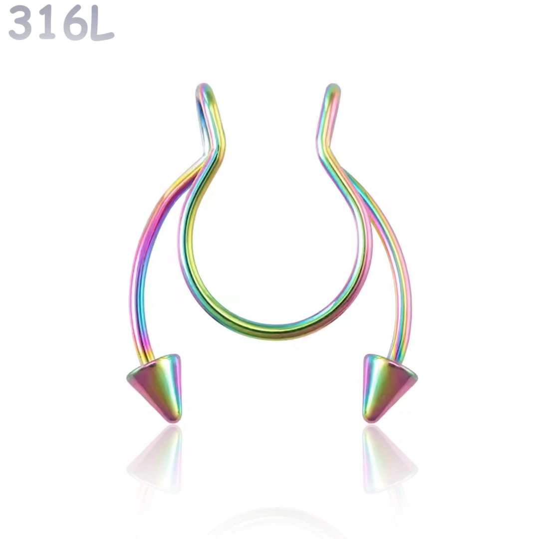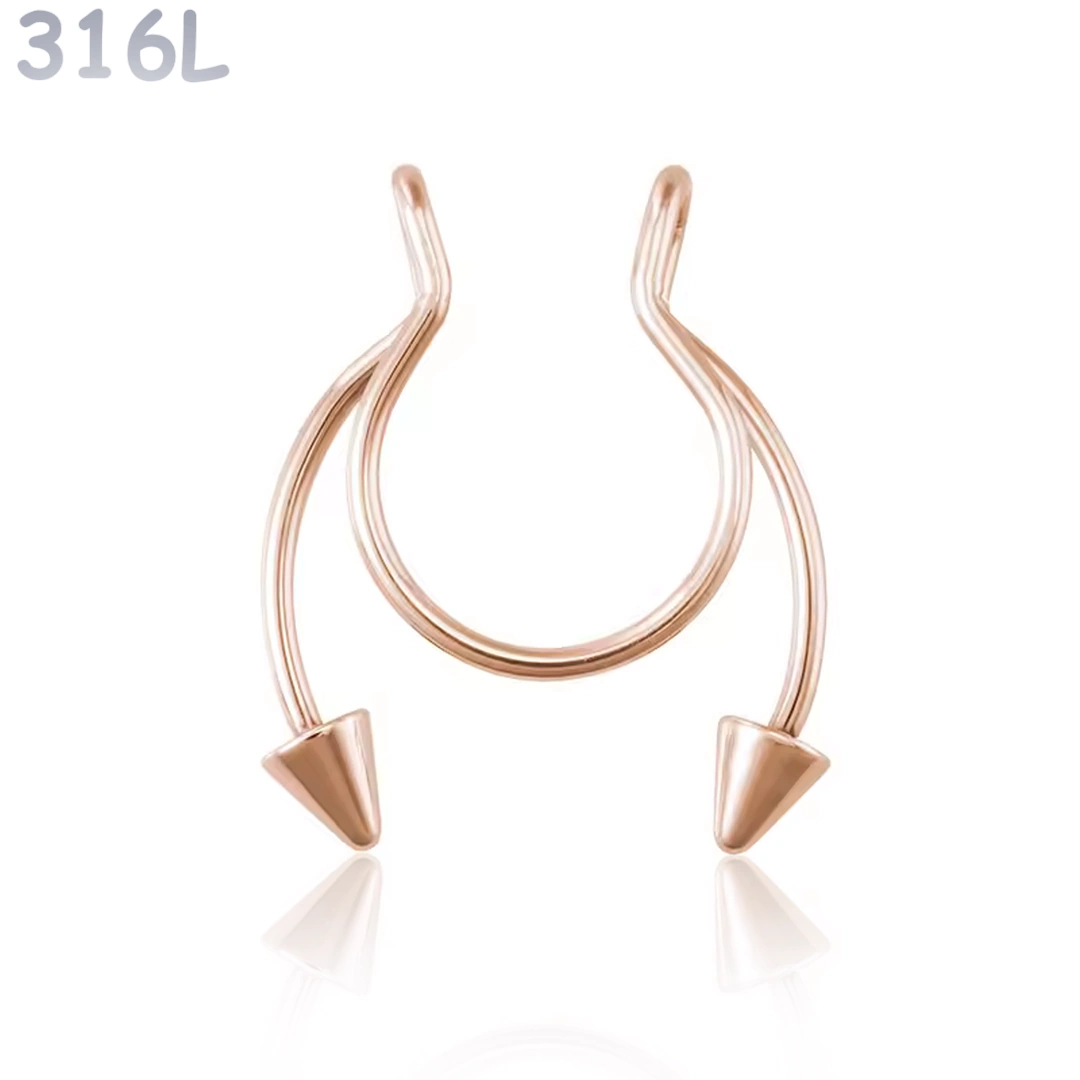 Faux piercing pour septum fer à cheval en acier chirurgical 316L avec pointes. Diamètre 8 mm, tige 0,8 mm. Sans perçage, style affirmé.