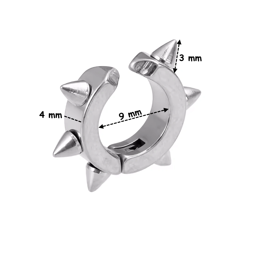 Faux piercing oreille anneau à pointes en acier 316L. Système clip sans perçage, diamètre 9 mm. Style punk, rock et affirmé. Vendu par paire.