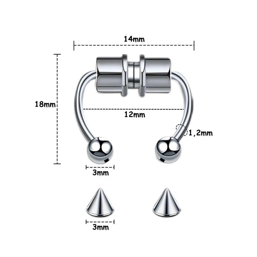 Faux septum magnétique en acier chirurgical 316L avec embouts interchangeables. Aimanté, réaliste et sans perçage. Diamètre 12 mm – billes et pointes 3 mm.