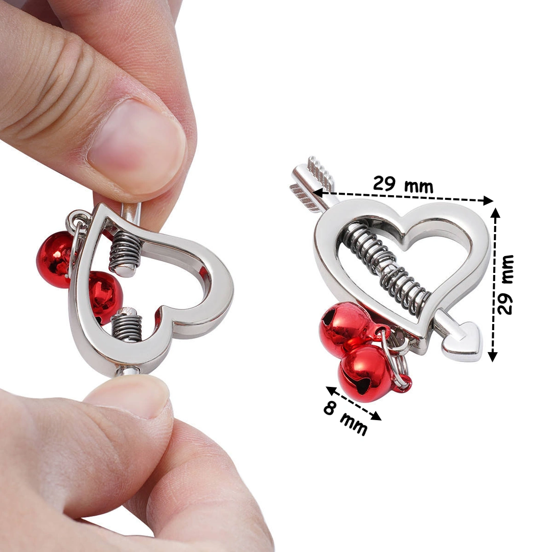 Faux piercing téton cœur et flèche en acier 316L avec ressorts. Sans perçage, maintien ferme. Version clochettes rouges ou cloche métal. Vendu à l’unité.