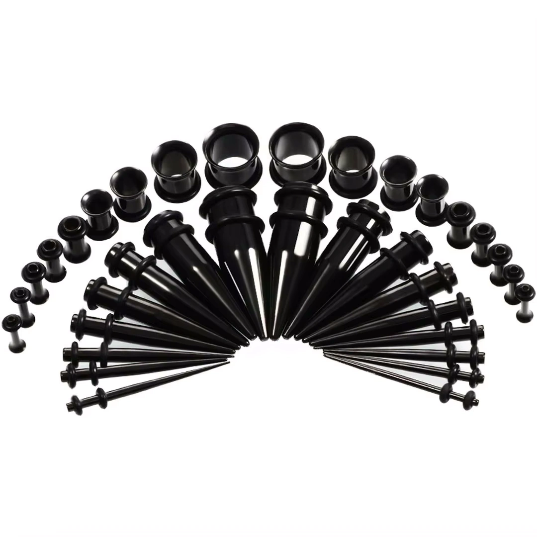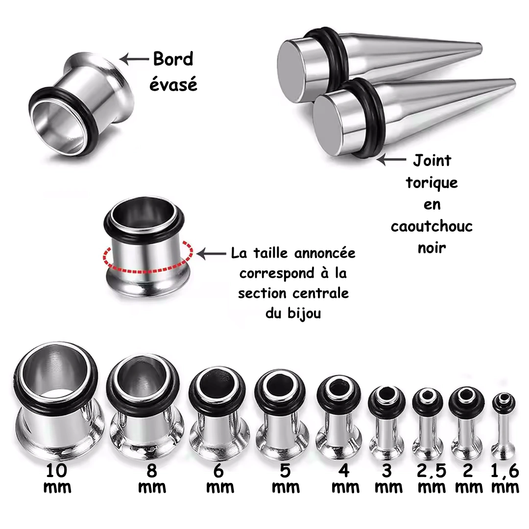 Kit de stretching oreille en acier chirurgical 316L avec tapers et tunnels. Diamètre 1,6 à 10 mm. Progression maîtrisée, finition polie ou noire PVD.