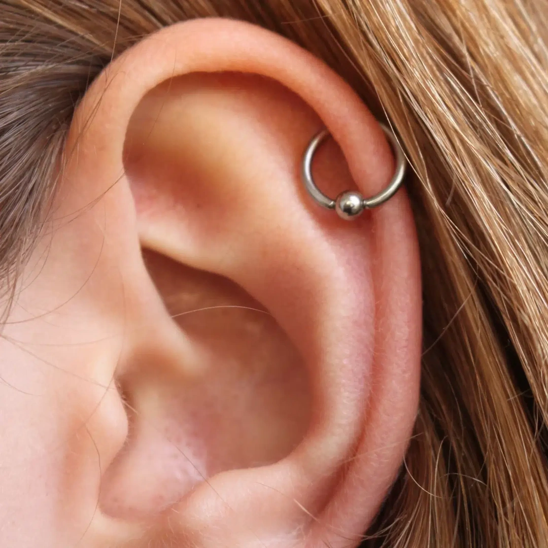 Anneau CBR en titane ASTM-F136, bille captive 3 mm. Disponible en 6–12 mm, épaisseur 1,2 mm, argenté, noir ou doré. Polyvalent lobe, cartilage, septum, lèvre et arcade.