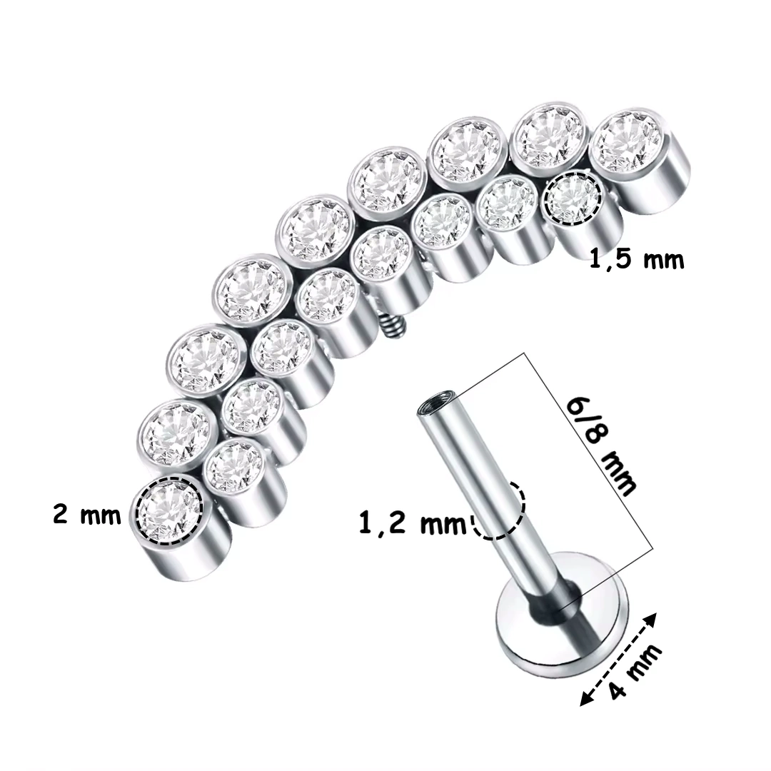 Piercing labret arqué en titane ASTM-F136, double ligne de zircons 2 et 1,5 mm. Lumineux, moderne et statement pour l’hélix ou le flat.