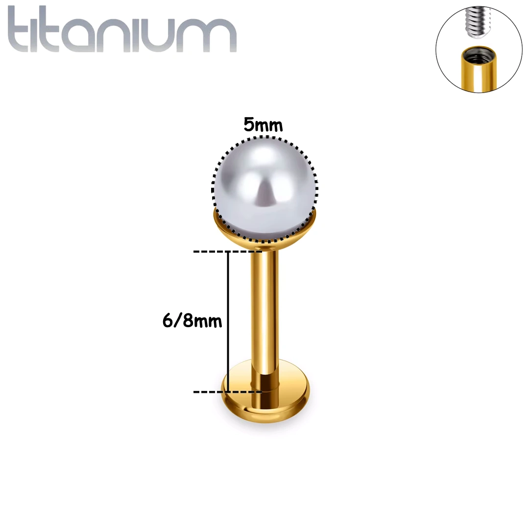 Labret filetage interne en titane ASTM-F136 avec perle nacrée 3, 4 ou 5 mm montée sur socle. Idéal oreille ou lèvre. Finition poli ou anodisé doré.