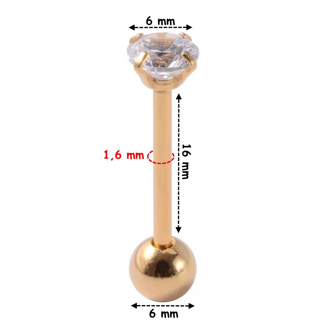 Piercing langue barbell 16 mm en acier chirurgical 316L avec zircon cubique 6 mm serti à griffes. Filetage externe, solide et confortable.