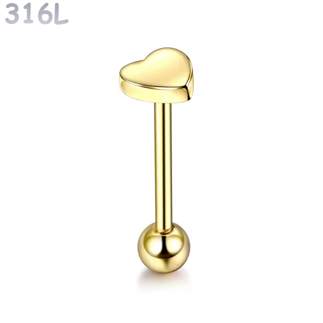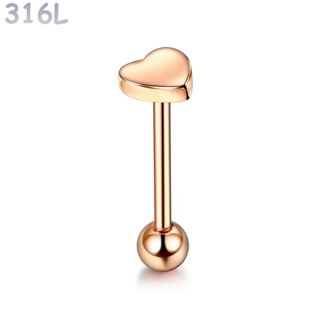 Piercing langue avec cœur en acier chirurgical. Barbell 16 mm, épaisseur 1,6 mm. Finitions poli, noir, doré, rose ou multicolore PVD. Discret, net, expressif.
