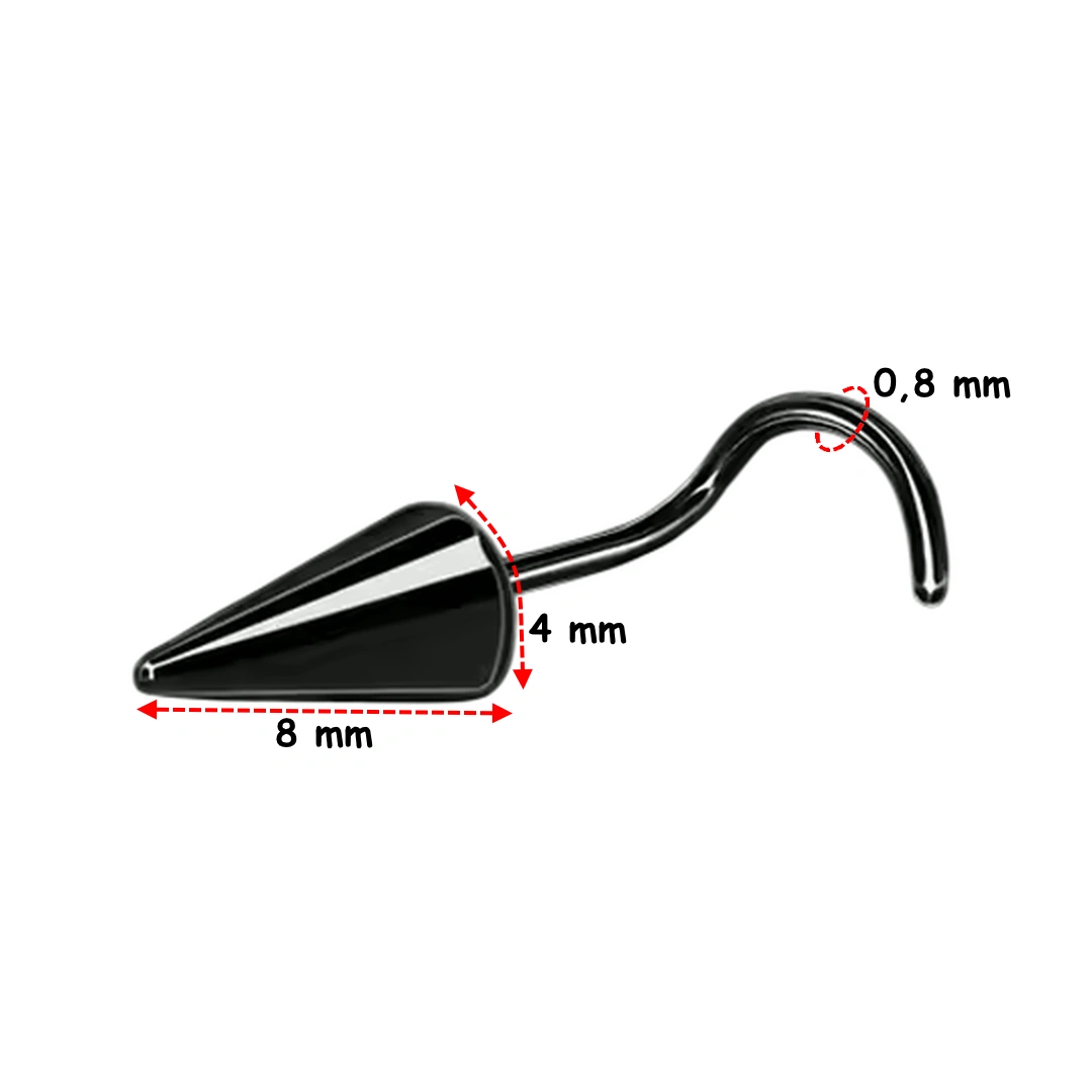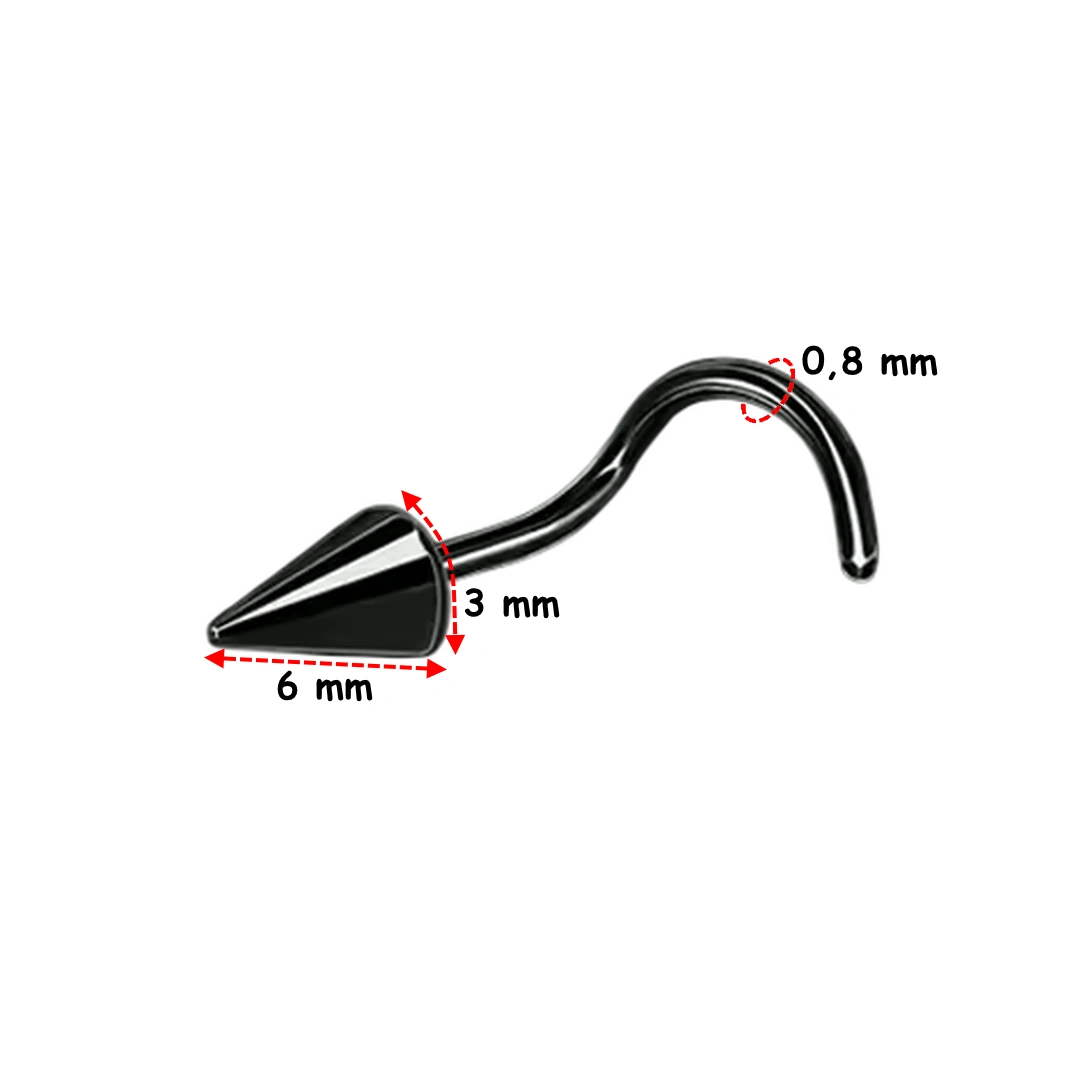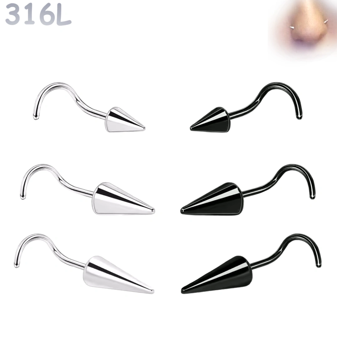 Piercing nez stud courbé en U à pointe conique 6, 8 ou 10 mm. En acier 316L poli ou noir PVD, pour un style affûté ou en double nostril avec chaîne.
