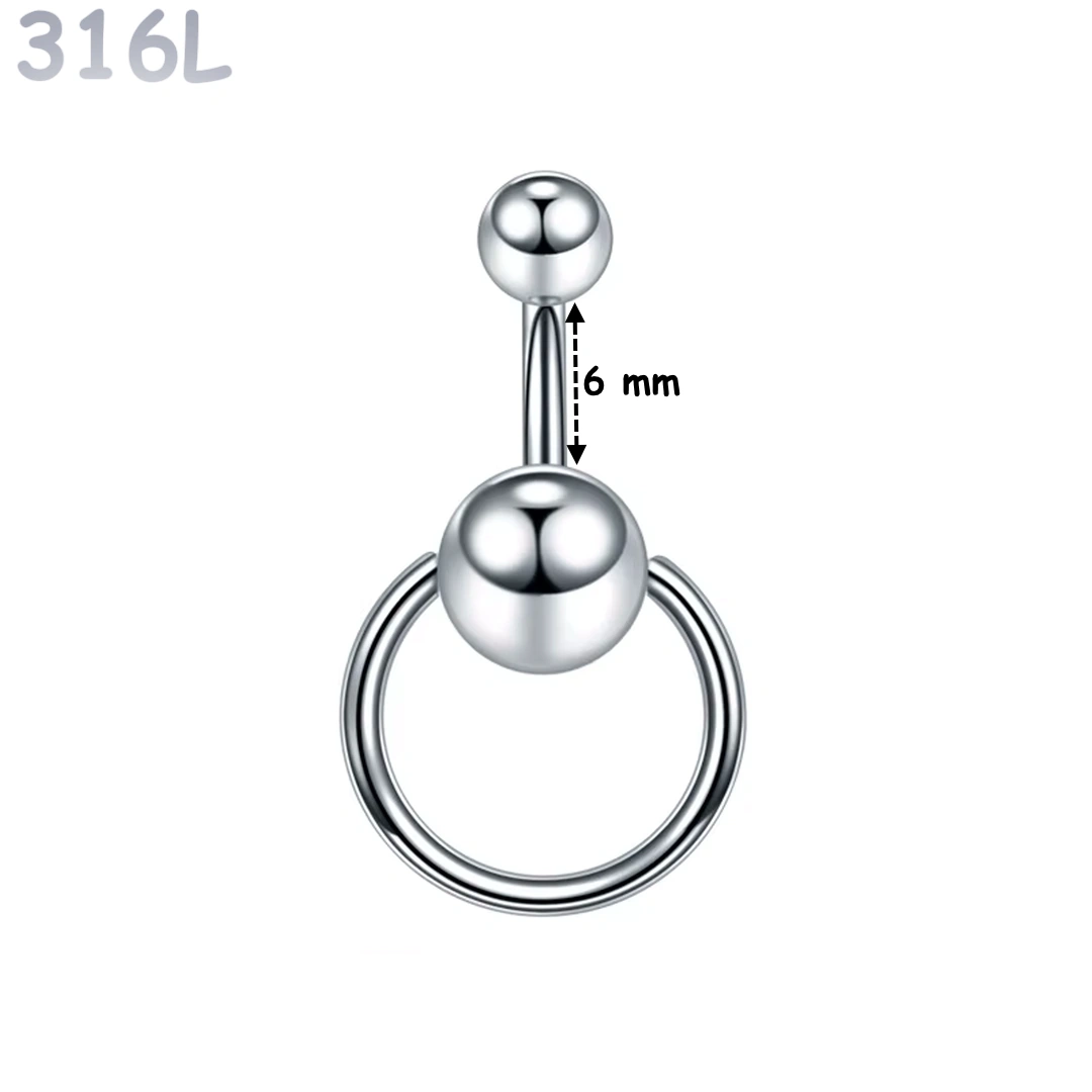 Ce piercing nombril en acier 316L revisite le barbell classique en y ajoutant un détail qui change tout : un anneau CBR suspendu, libre de bouger à chaque mouvement du corps.