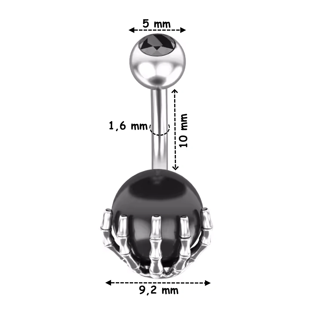 Piercing nombril en acier 316L avec sphère noire sertie d’une main squelettique. Bijou gothique, expressif et confortable, idéal pour un look dark affirmé.