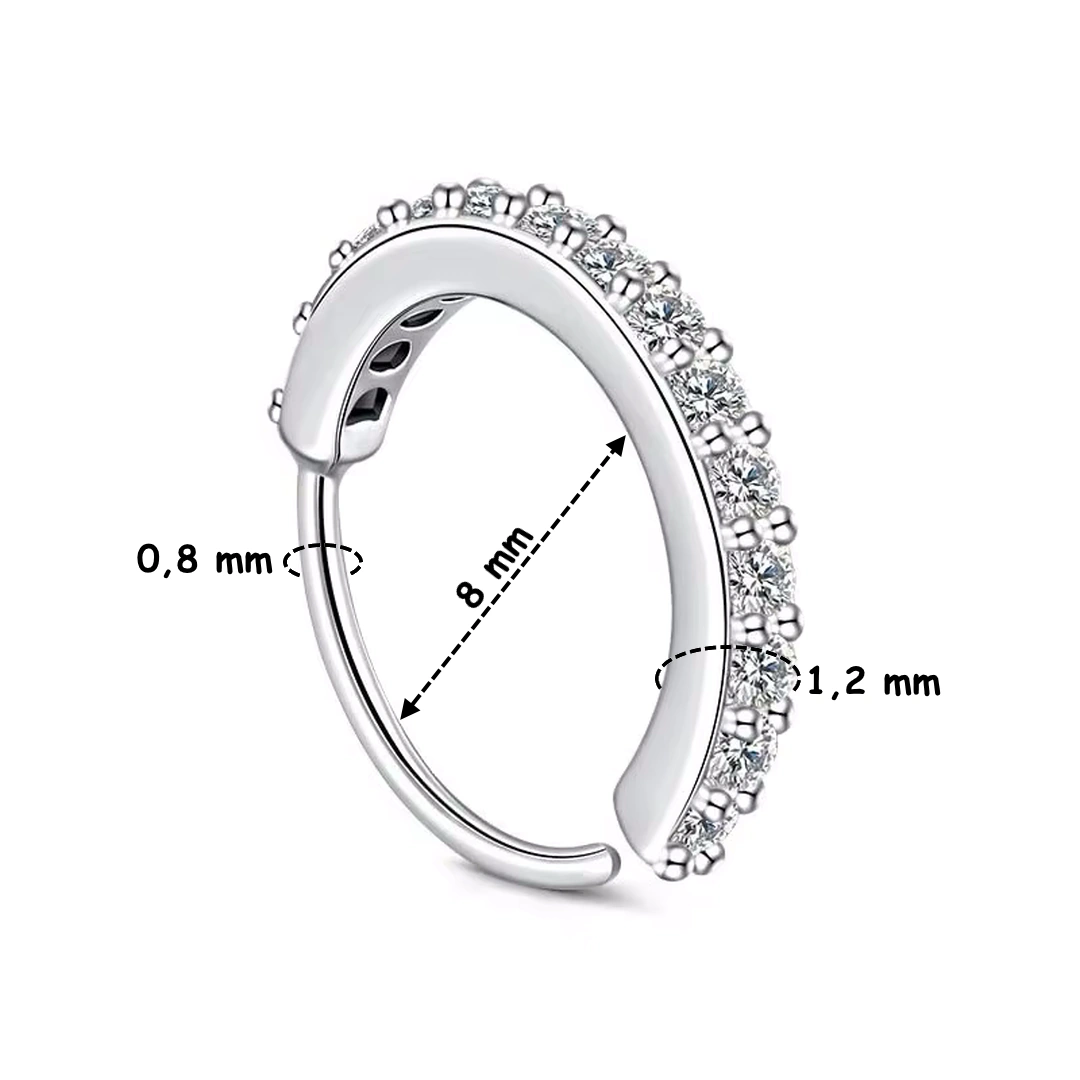 Anneau clicker pour narine en acier chirurgical 316L, orné de zircons cubiques. Finition argentée, dorée ou or rose PVD. Diamètre 8 mm.