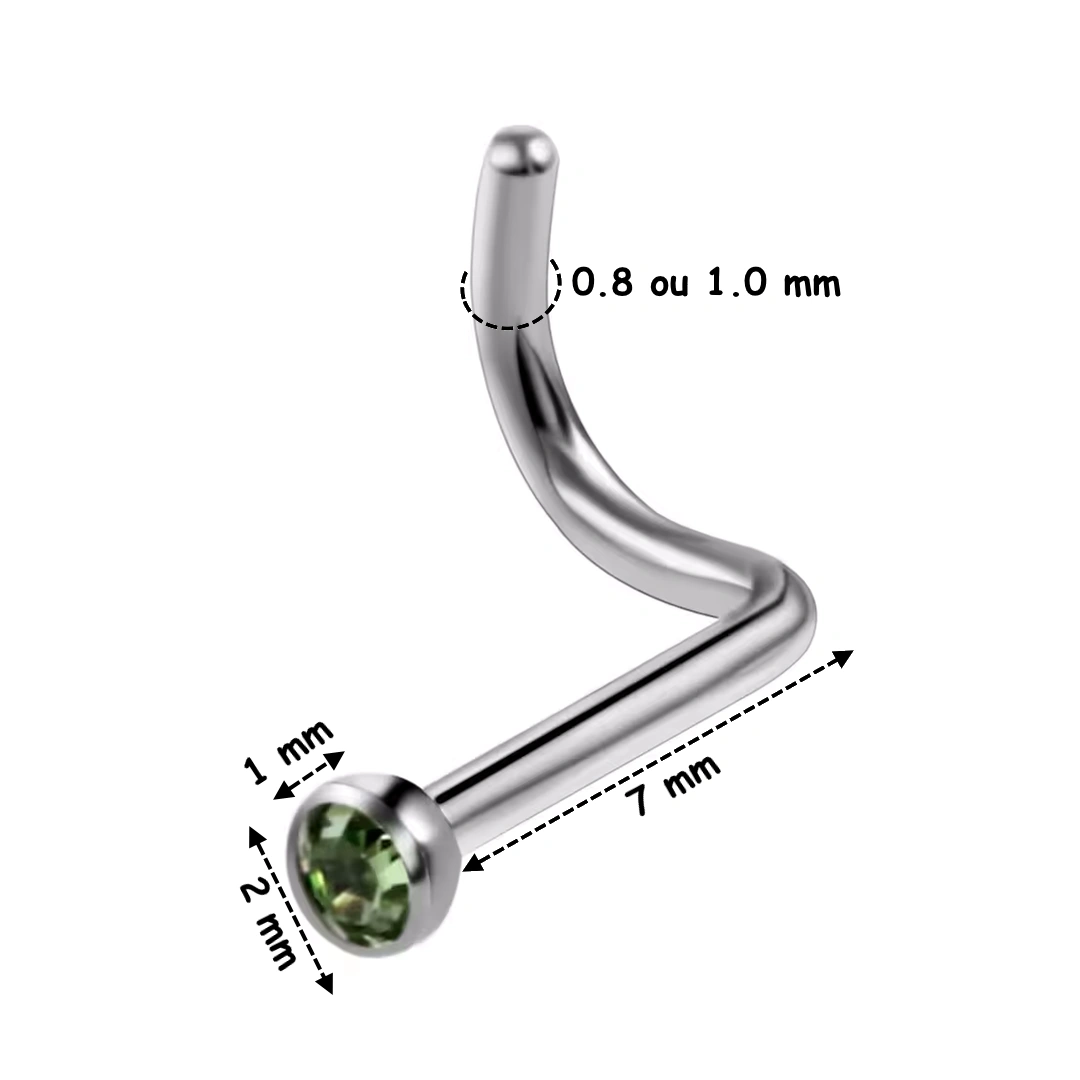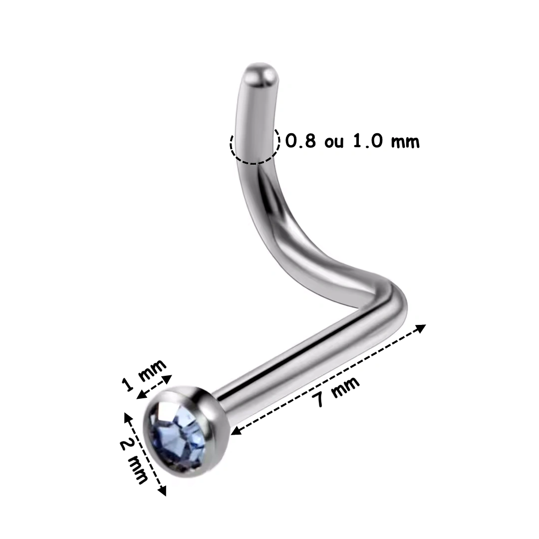 Stud courbé en titane ASTM-F136 pour piercing narine, orné d’un zircon 2 mm. Tige 0,8 ou 1,0 mm, longueur 7 mm. Sept couleurs éclatantes au choix.