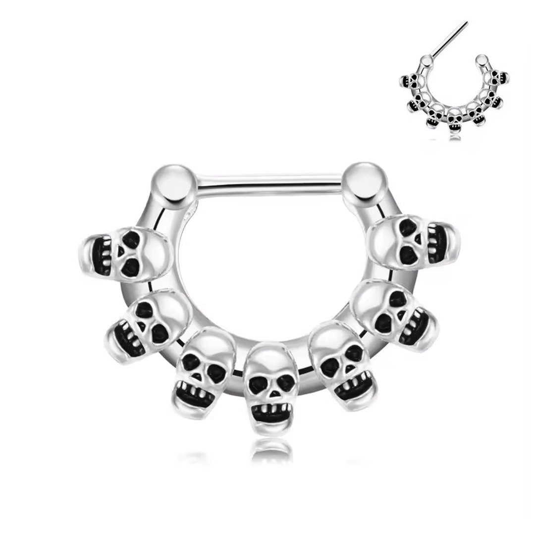 Piercing septum anneau clicker en acier 316L avec rangée de têtes de mort. Épaisseur 1,2 mm, diamètre 8 mm. Style gothique espiègle.