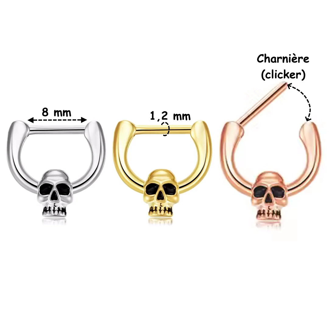 Piercing septum anneau clicker en acier 316L avec tête de mort détaillée. Épaisseur 1,2 mm, diamètre 8 mm. Style gothique affirmé.