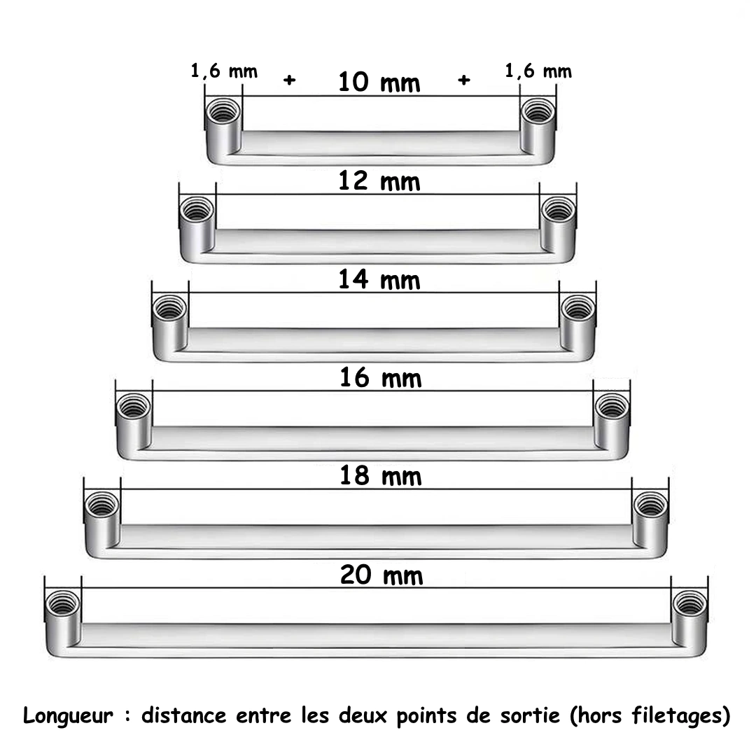 Disponible en plusieurs longueurs — 10 mm, 12 mm, 14 mm, 16 mm, 18 mm et 20 mm — elle permet d’ajuster précisément l’écartement entre les deux sorties. Un choix essentiel pour éviter toute compression ou instabilité liée à une longueur inadaptée.