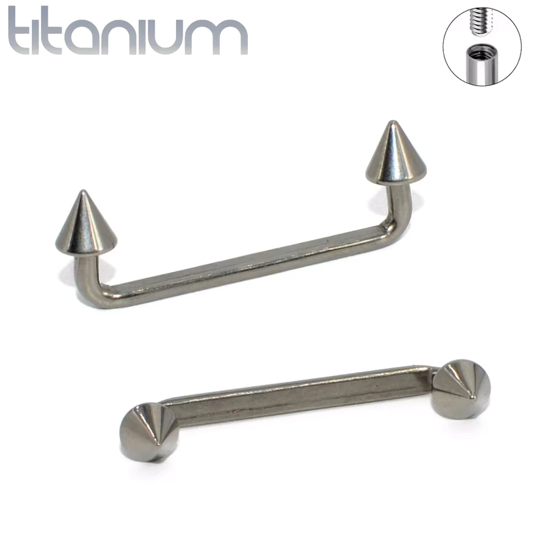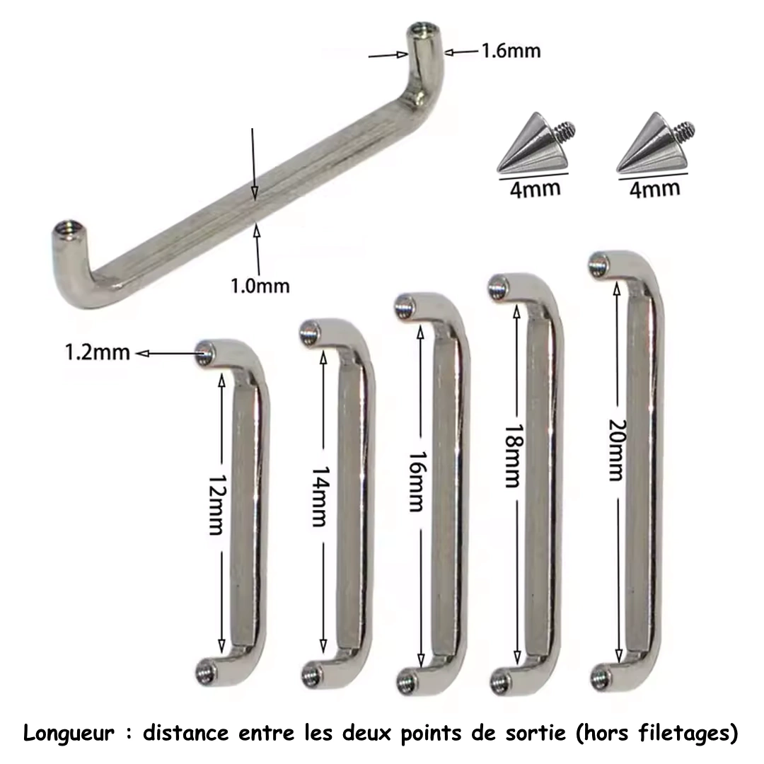 Piercing de surface en titane ASTM-F136 à pointes. Agrafe stable, longueurs 12 à 20 mm. Filetage interne sécurisé. Idéal sternum (poitrine), dos, tragus.